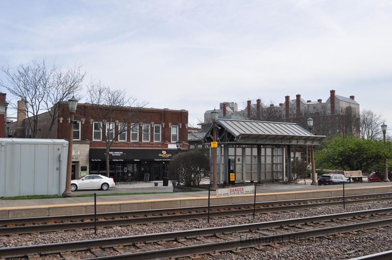 109 -111 E. First Street, including business tenants Gloria Jean's Coffee and Red Arrow Tap Room, viewed from the south side of the Metra railroad tracks.Photograph Details