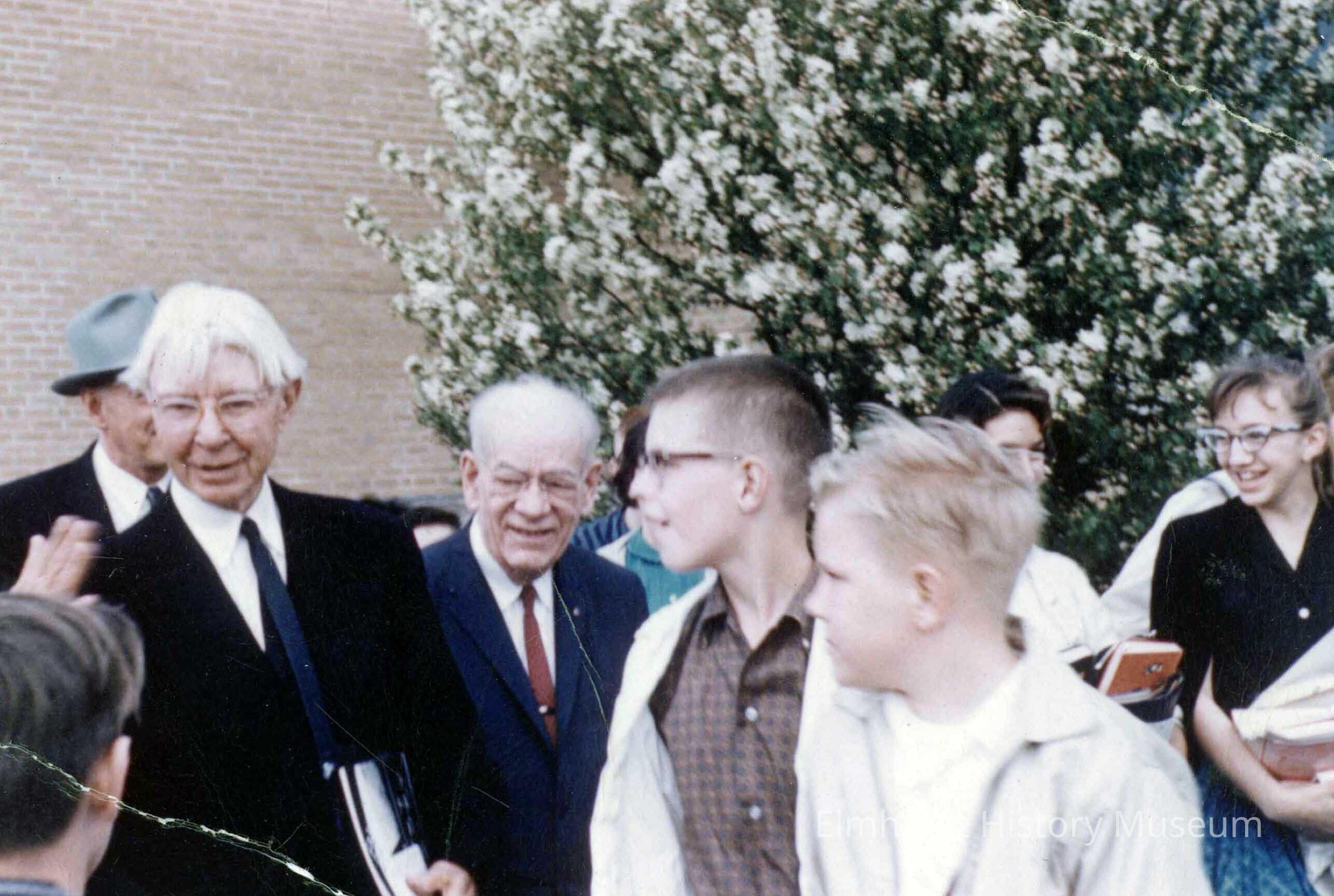 Color photograph. Poet, author and former Elmhurst resident Carl Sandburg on the left with Elmhurst historian Helmut Berens and students at Sandburg Junior High School, 345 E. St. Charles Road. This was the day that Elmhurst Junior High School was renamed Sandburg Junior High School.Photograph Details