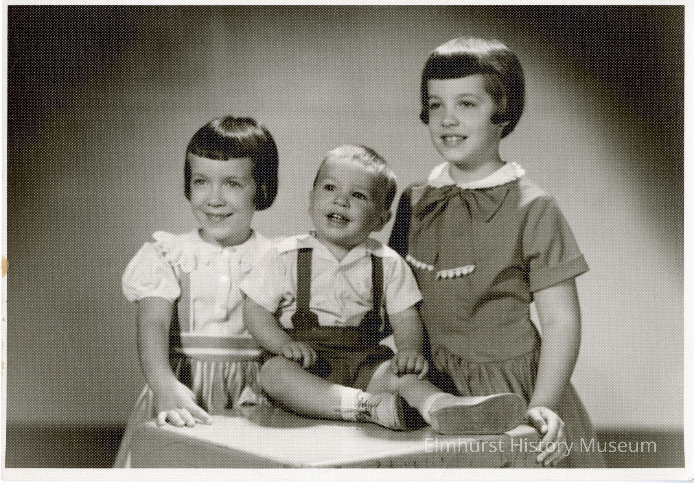 Formal portrait of siblings Nancy, Jim, and Carol Wilson.