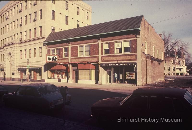 View of the Carriage Shop and Country Vogue stores next to the Elmhurst National Bank at 109-113 S. York Street.Photograph Details