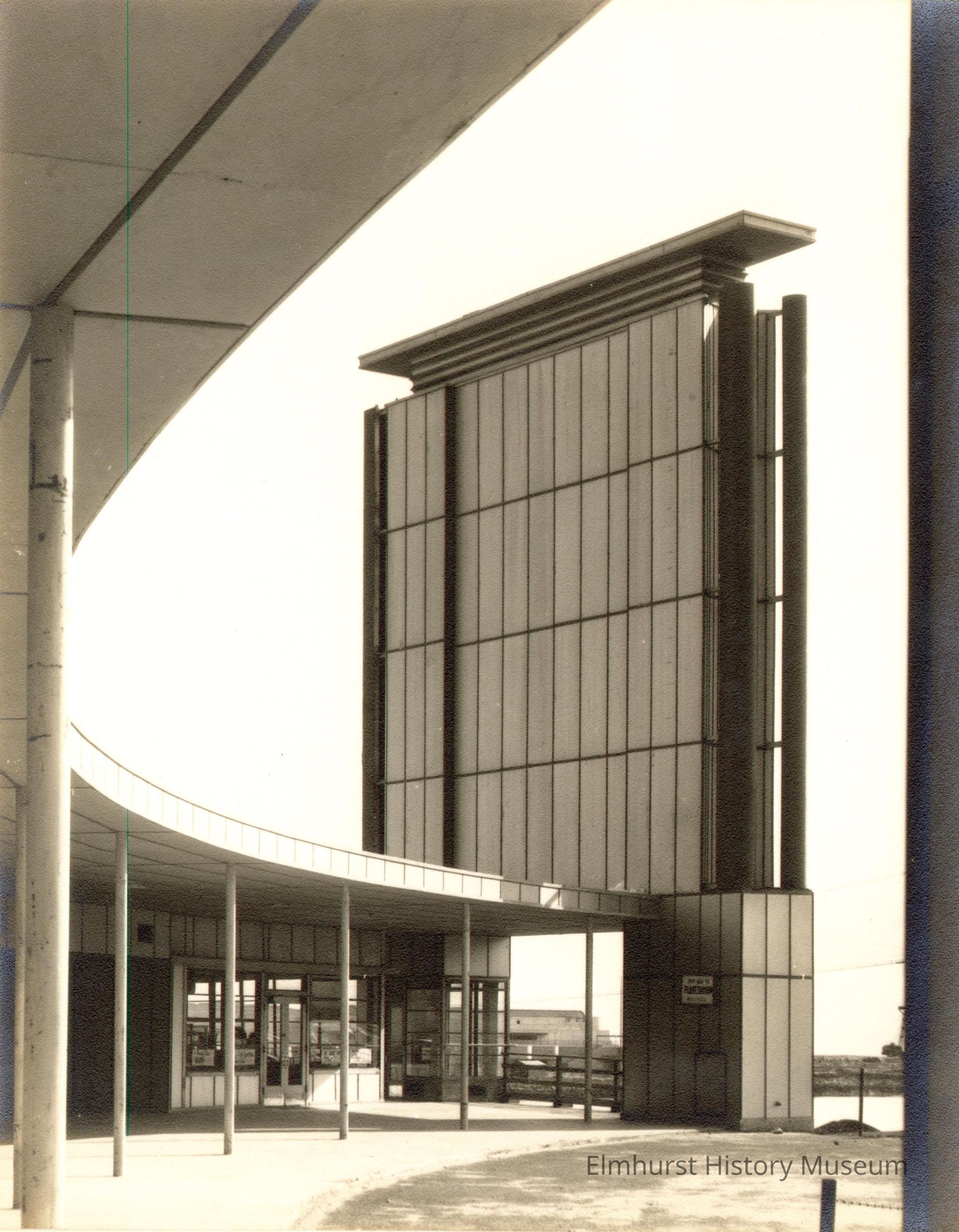Photo of the 12th Street entrance to the Century of Progress 1933-34 Chicago World's Fair. A flat upright tower-like structure is in front of a curved covered walkway with roof supported by round columns. Photo is taken from a point under the roof looking outward. A doorway and windows at left have signs in them. A dirt driveway is beside the cement walkway. Photo is mounted on ecru paperboard mat.Photograph Details