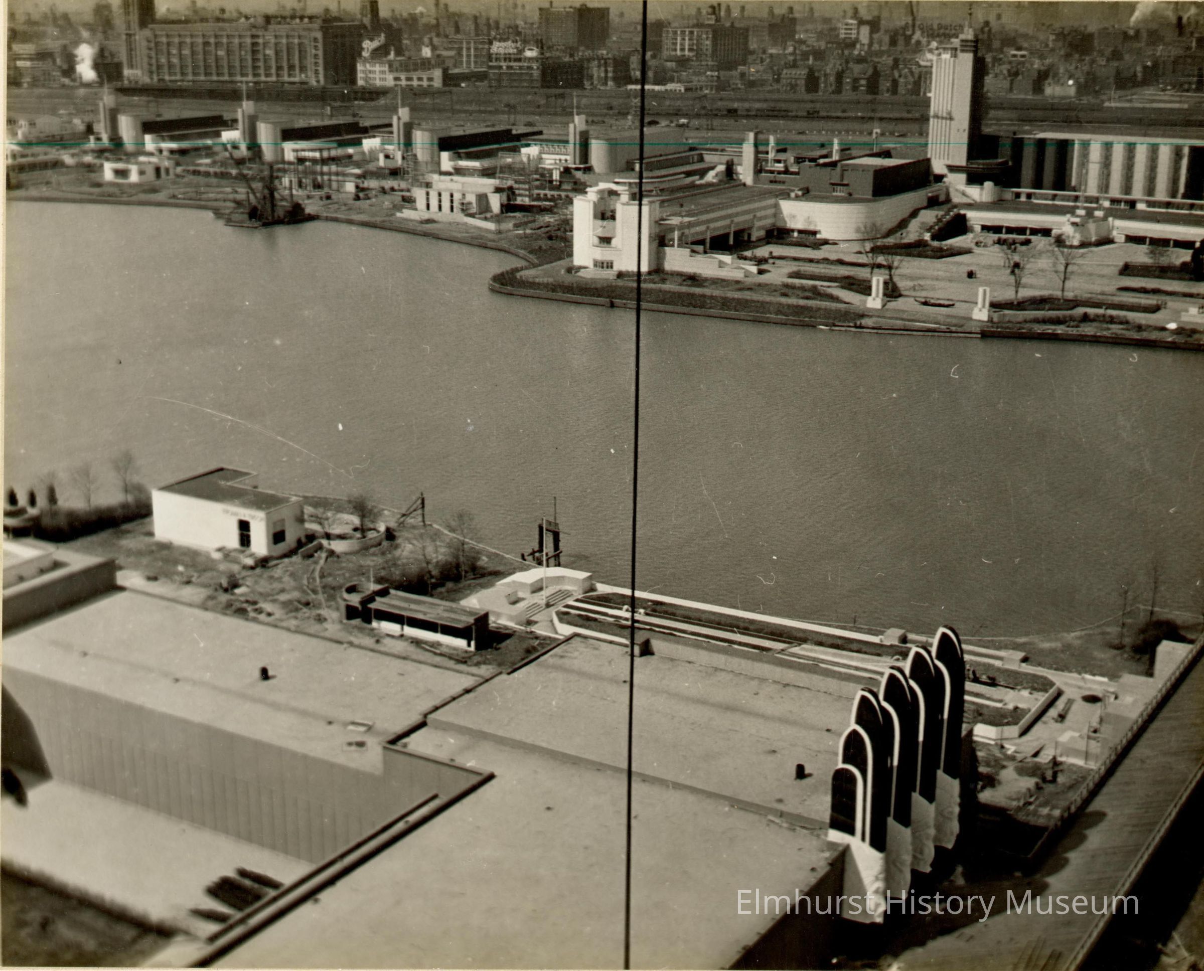 Aerial view of Century of Progress 1933-34 Chicago World's Fair. Camera is looking toward the city buildings in the background. Lagoon is in the center of photo and flat roof of a large building with white-trimmed vertical uprights is in the foreground. A vertical black line is in the center of the phot. Photo is mounted on ecru paperboard mat.Photograph Details