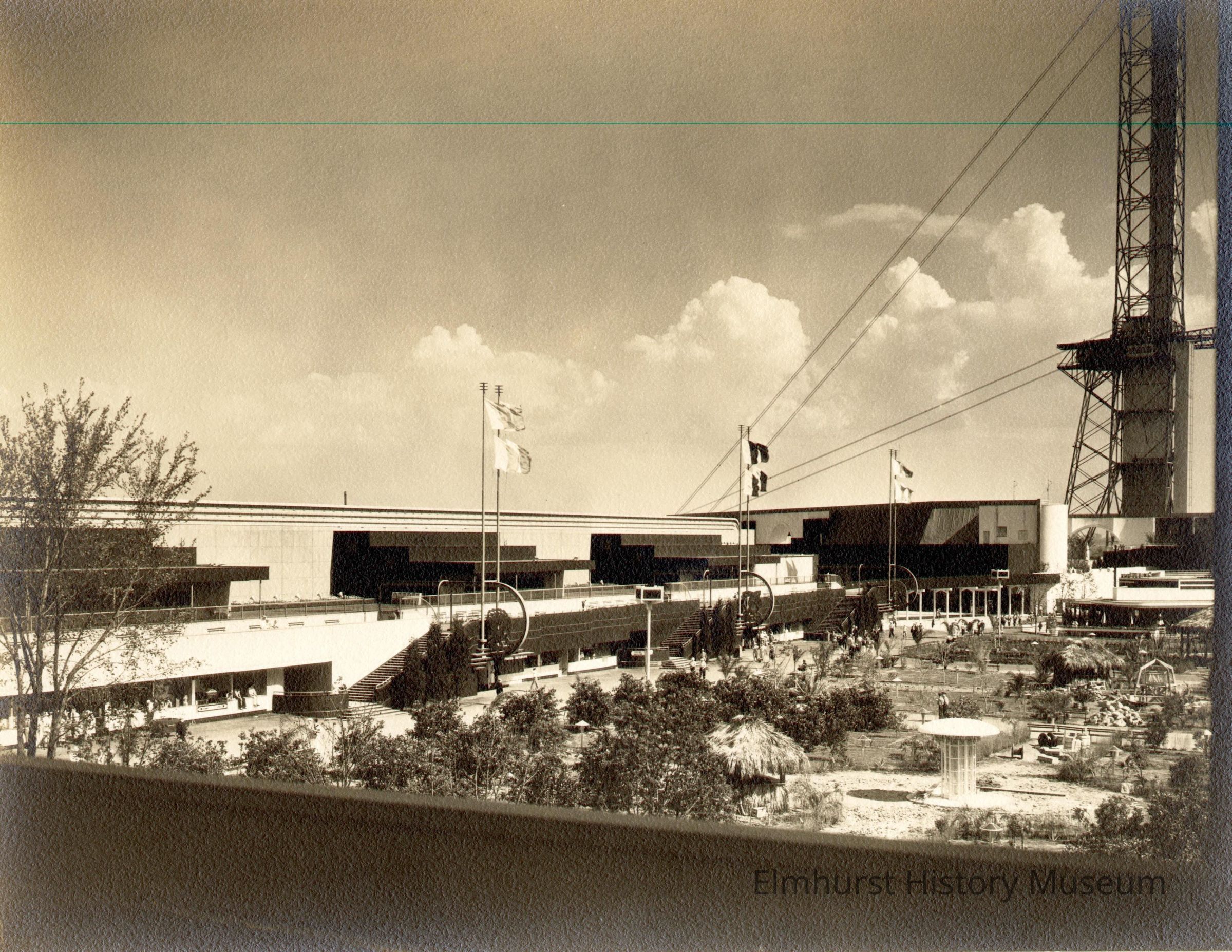 View of the Agriculture Building and Florida Gardens at the Century of Progress 1933-34 Chicago World's Fair. A sunken garden with bushes and small trees, two thatched roof structures, a kiosk with a round roof and other "works in progress" is in front and at right in photo. An openwork steel tower is at right edge. A long horizontal building in light color with 3 projecting dark canopies is above and to left of garden. Steps lead up from garden level. Three sets of double flagpoles with flags are at edge of garden. Sky has puffy clouds. Photo is mounted on ecru paperboard mat.Photograph Details