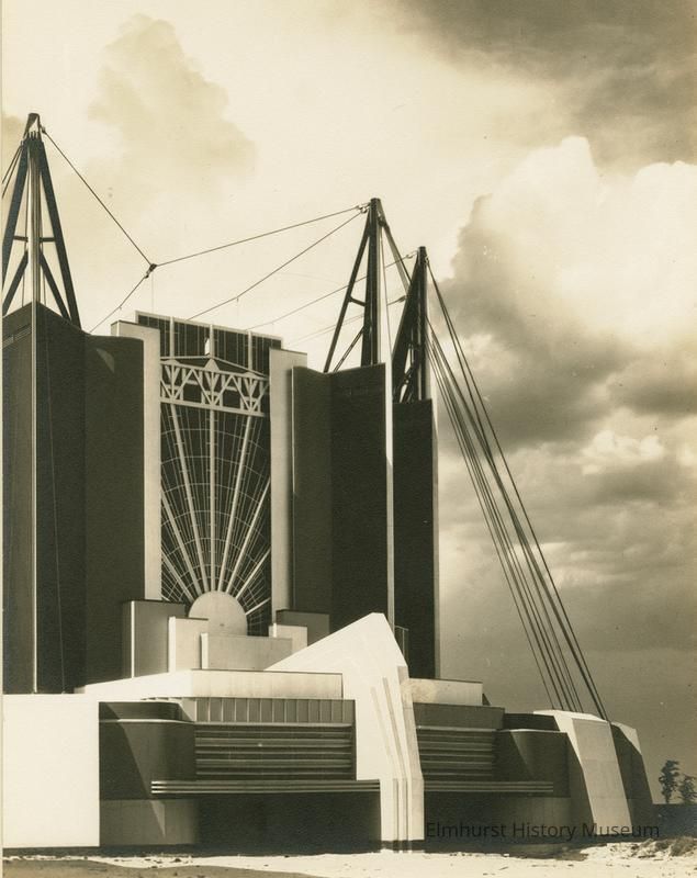 The Century of Progress Travel & Transport Building, 1933-1934 World's Fair, Chicago. Photo has strong vertical elements with guide wires from tops of triangular structures atop columns. Central panel has ray-like projections from a disk at the bottom. Horizontal part in front has contrasting black and white elements. There are dramatic clouds in the background. Photo is of the dome of the building with its roof supported by the cables or guide wires. It is mounted on a paperboard mat. (negative 2878-5)Photograph Details