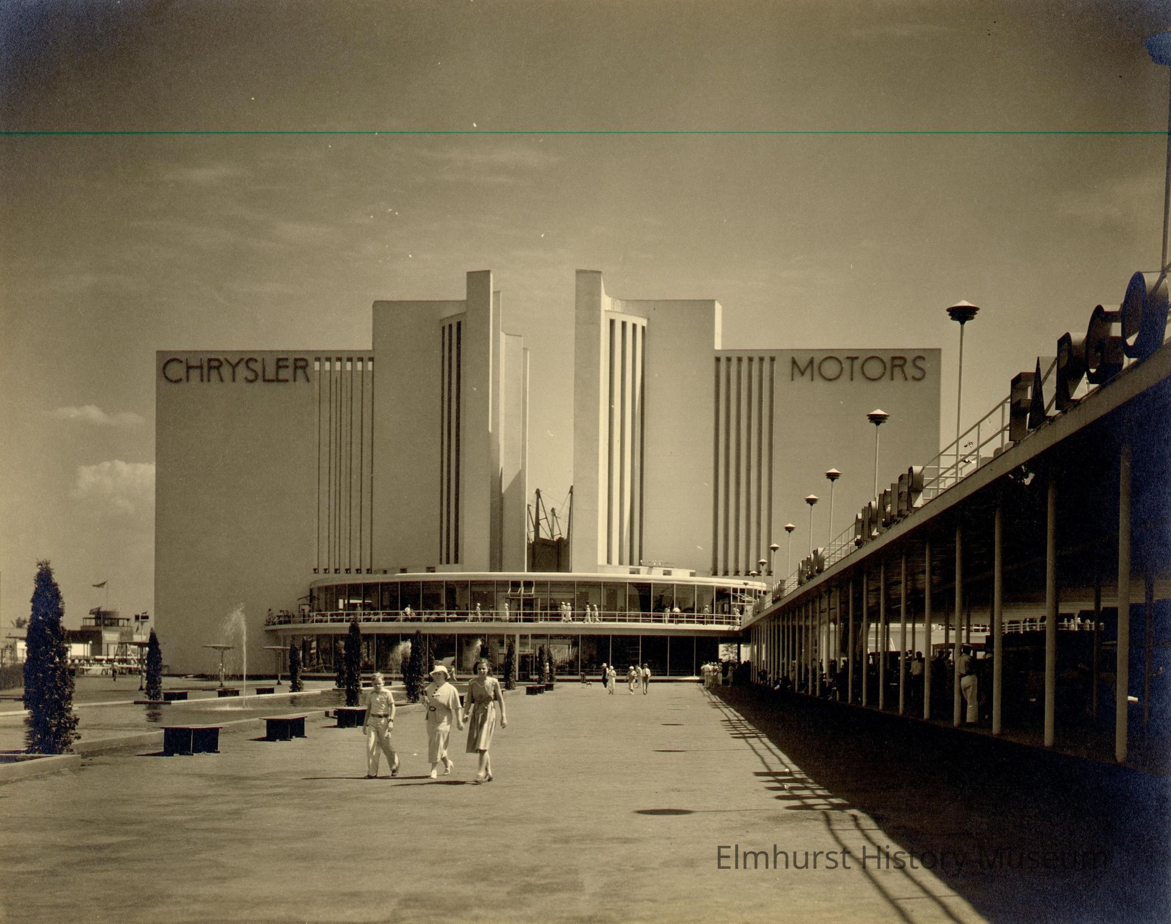 Chrysler Motors Building at the Century of Progress Chicago 1933-34 World's Fair. The twin halves of the white building are tied together by the 2-story covered deck in the center. Vertical slits in the facade appear dark. An open 2-story passageway extends along the left side of the photo with lettering on the railing at the top. Benches are at left of wide walkway in front overlooking reflecting pool at the left. "CHRYSLER MOTORS" is at top of the building. Photo is mounted on ecru paperboard mat.Photograph Details
