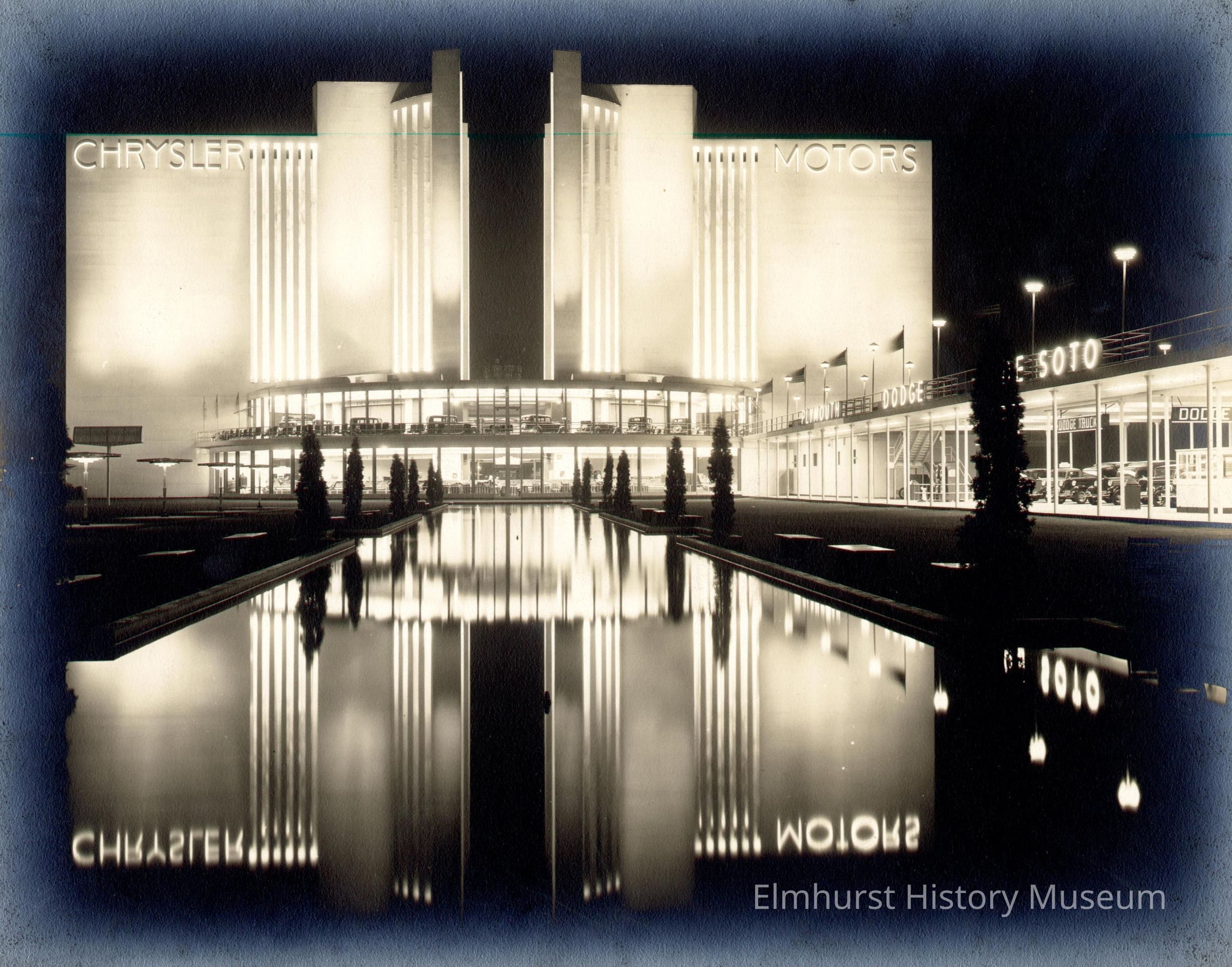 Chrysler Motors Building at the Century of Progress 1933-34 Chicago World's Fair. Facade of the building is brightly lit and interior of the two-story rotunda and one-story wing are illuminated. The lighting and slender trees along the pool are mirrored in the reflected pool. The opening between the two halves of the building show dark. Cars in the rotunda and wing show as well. Lighted capital letters read "CHRYSLER MOTORS, PLYMOUTH, DODGE, DESOTO." Inside wing has "DODGE TRUCKS." Photo is mounted on ecru paperboard mat.Photograph Details