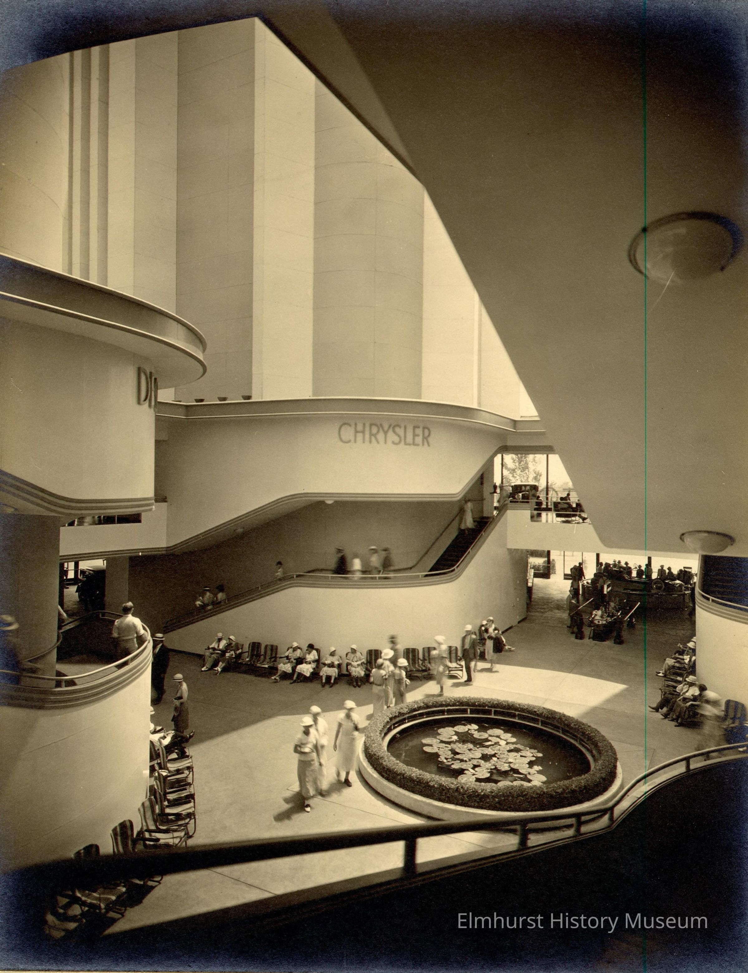 Courtyard of the Chrysler Motors Building at the Century of Progress 1933-34 Chicago World's Fair. Photo is mounted on ecru paperboard mat.Photograph Details