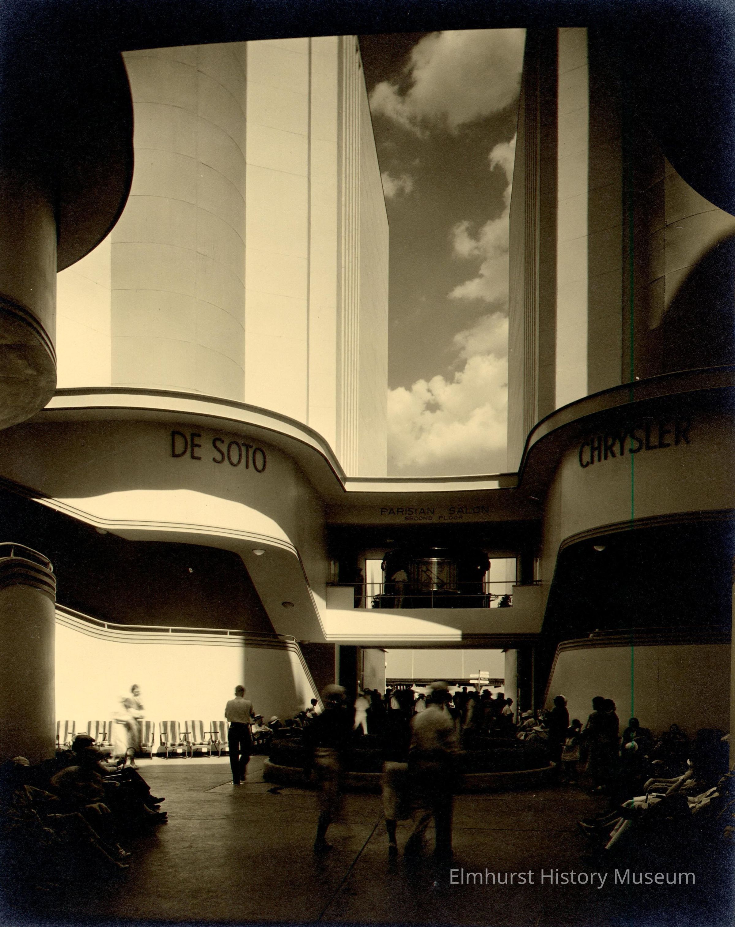 Courtyard of the Chrysler Motors Building at the Century of Progress 1933-34 Chicago World's Fair. This interior shot at floor level shows dramatic light/dark contrast. Two levels of stairways are beyond people walking, standing or sitting around a circle with a low trimmed edge. A section of sky with clouds shows through an opening above the stairs. The sun lights up the left side of the photo. The right side looks dark. Above the landing is "PARISIAN SALON second floor." Above the stairway is "DE SOTO" on the left and "CHRYSLER" on the right. Photo is mounted on ecru paperboard mat.Photograph Details