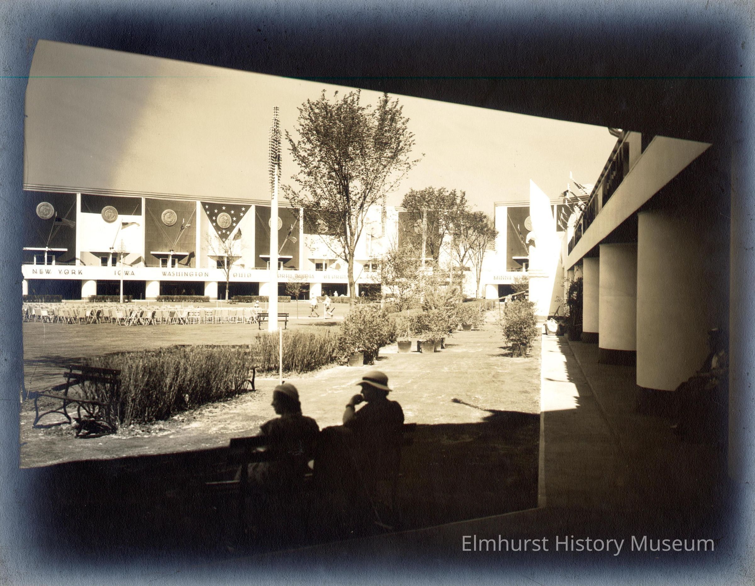 Court has trees, bushes, benchs and a big group of tables and folding chairs. This is the Court in the Hall of States at the Century of Progress 1933-34 Chicago World's Fair. Two women on a bench are silhouetted against bright light of courtyard. Backgrounds of state seals are alternately dark and light. Photo is mounted on ecru paperboard mat.Photograph Details