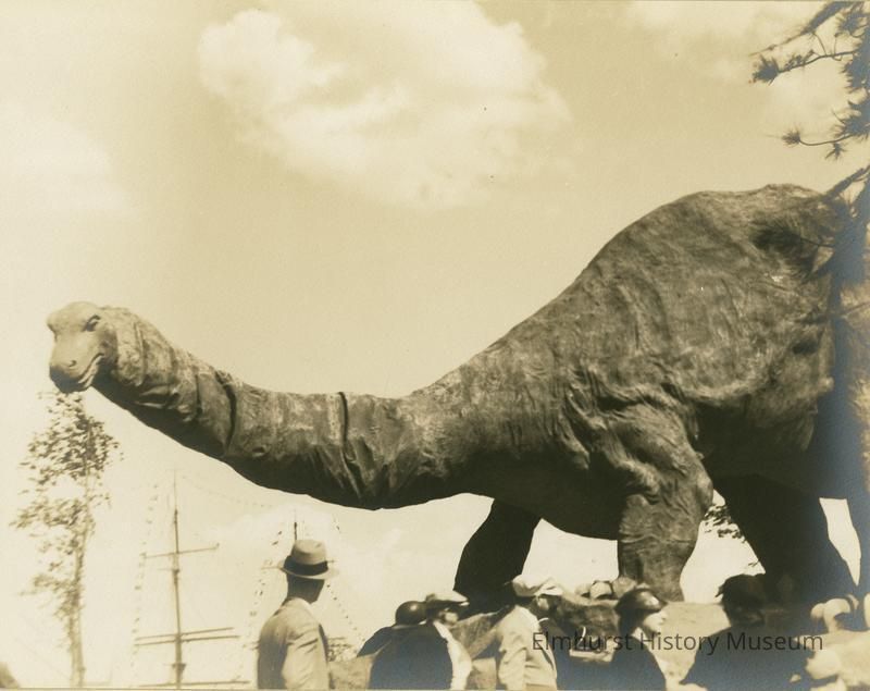 View of a dinosaur sculpture from the Century of Progress Chicago 1933-34 World's Fair. Head, neck and about 3/4 of body of a brontosaurus type dinosaur are silhouetted against the sky. Pedestrians in front are barely knee-high to the beast. Top of an evergreen tree appears at right and masts of 2 sailboats appear below the neck. A small tree is below the dinosaur's head. Photo is mounted on ecru paperboard mat.Photograph Details
