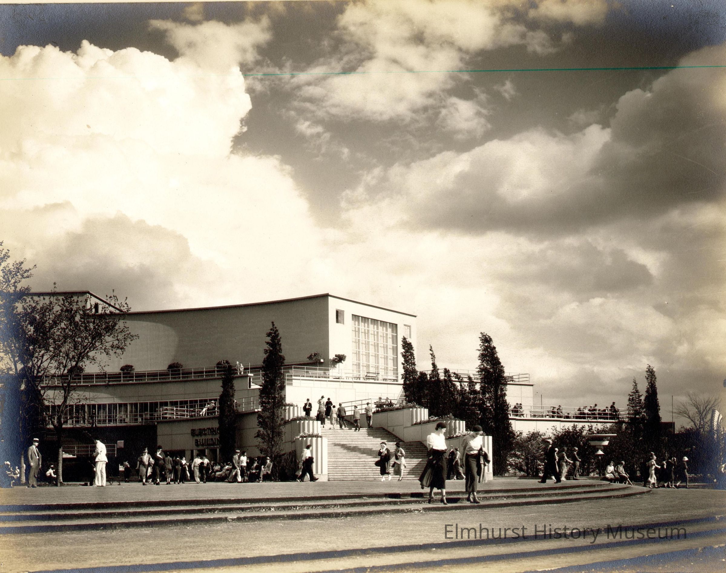Electrical Building at the Century of Progress 1933-34 Chicago World's Fair. In the foreground are 2 sets of 3 steps leading up to a long flight of steps leading up to an open terrace with a railing. Above that is another terrace around a long windowless wing (except for windows at the end). A few trees are beside the steps. Dramatic cloud formations are above the building. Photo is mounted on ecru paperboard mat.Photograph Details