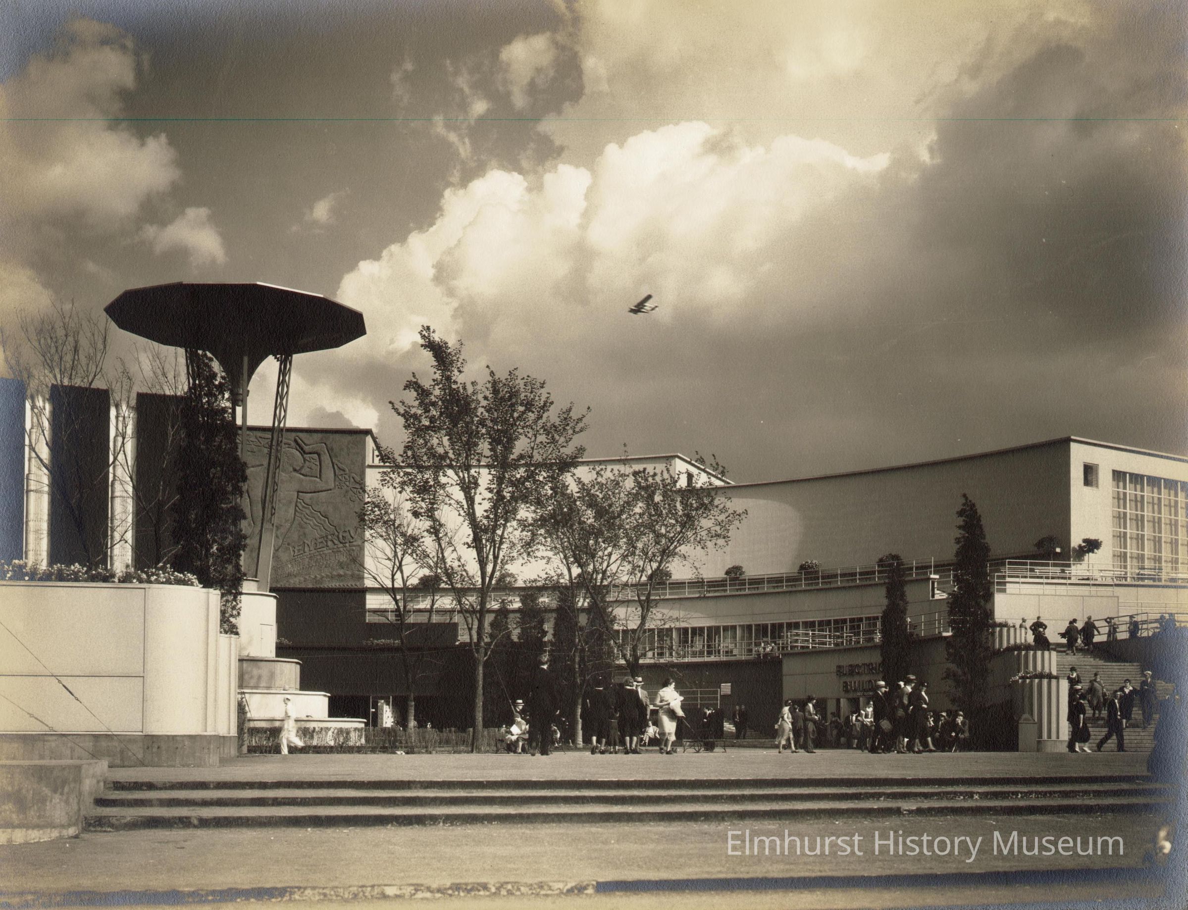 Electrical Building at the Century of Progress 1933-34 Chicago World's Fair. People are walking in front of building or up steps. Plane is flying over the building. Photo is mounted on ecru paperboard mat.Photograph Details