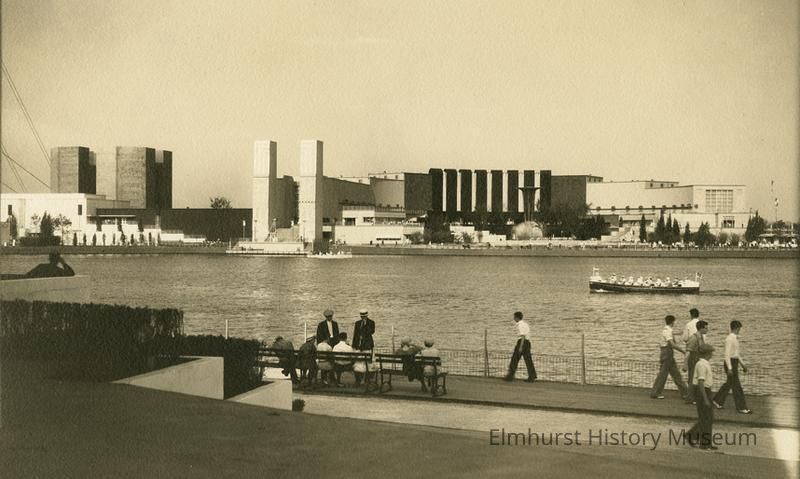 People walking on a sidewalk or sitting on bench in foreground. The group of buildings across a body of water, the Electrical Group at the Century of Progress 1933-1934 World's Fair in Chicago, have dark and light contrasts. Two boats full of sightseers are in the water. Photo is taken from the entrance to another building and a reclining statue is on the cement at left beyond hedge. There is a wire fence between the sidewalk and the water. There is access to an Electrical Group building from the water. Photo is mounted on an ecru paperboard mat.Photograph Details