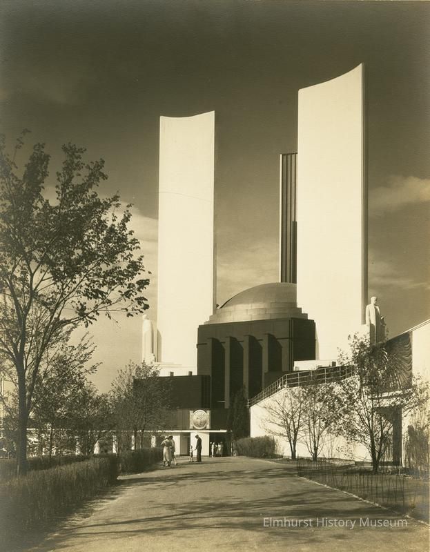 Federal Building at the Century of Progress 1933-34 Chicago World's Fair. A white statue is at the second story level beside each pylon. A low wing extends to left and a 2-story wing extends right. A hedge-lined street leads toward the dome. A reproduction of the U.S. Seal is above entrance. Small trees are on each side of roadway. A few pedestrians are near the entrance. Photo is mounted on ecru paperboard mat.Photograph Details