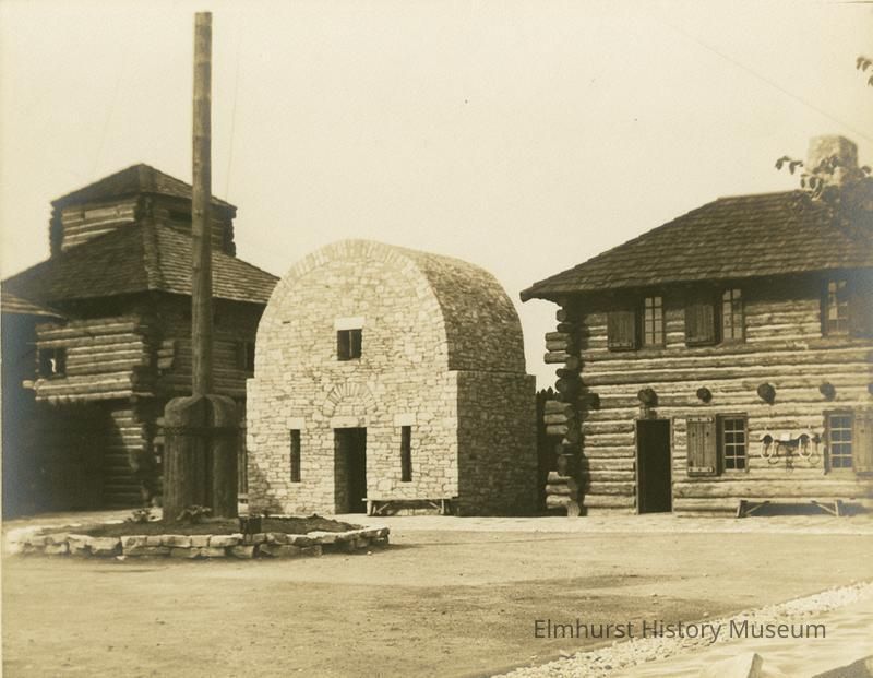 Fort scene at the Century of Progress 1933-34 Chicago World's Fair. View is inside a stockade showing a large outdoor stove oven with rounded top and 2 log buildings with shingle roofs. A large pole (flag?) is in a dirt-filled circle of stones in unpaved central courtyard. An ox yoke is hanging on the outside wall of out building. Windows have shutters. One building (blockhouse?) has a one-story tower, making it a 3-story building. Photo is mounted on ecru paperboard mat.Photograph Details
