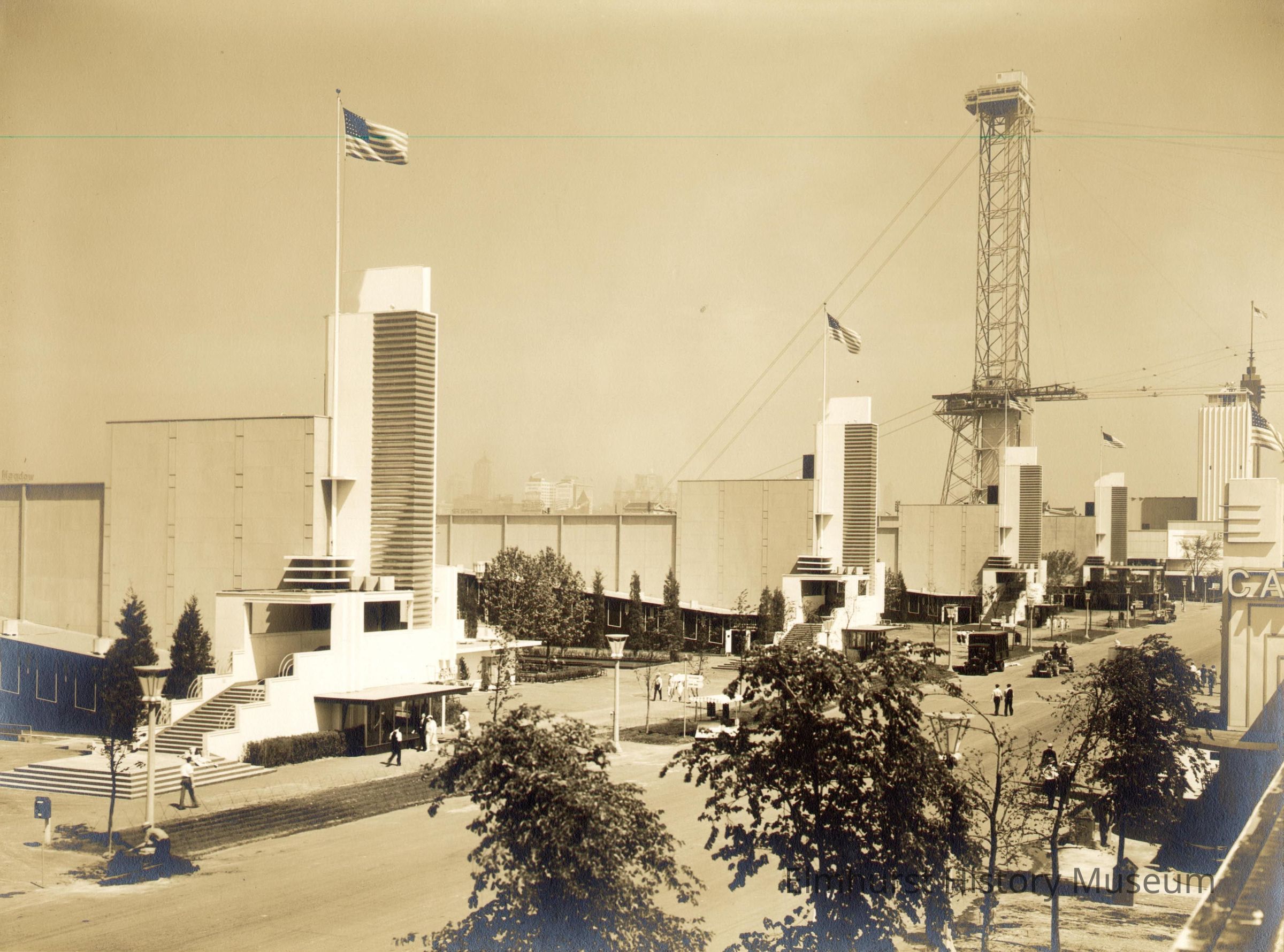 The General Exhibits Building at the Century of Progress 1933-34 Chicago World's Fair. Flags on poles fly above 4 black and white towers with steps providing entrance to the 4 pavilions of the building. Ramp leads up from each entrane. Steel open-work tower with platforms at 2 levels and wires going out from it is near right edge of image. Some small trees and street lamps are along a roadway. Photo is mounted on ecru paperboard mat.Photograph Details