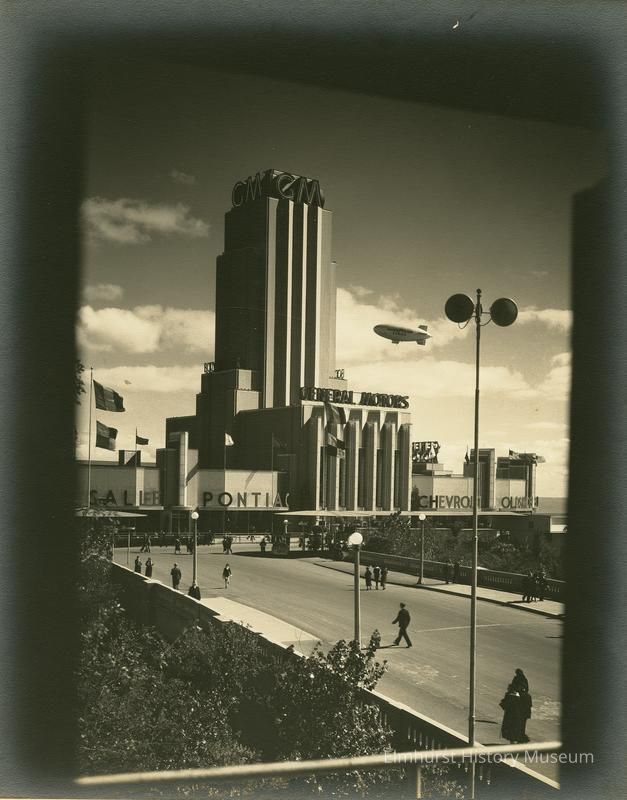 General Motors Building at the Century of Progress 1933-34 World's Fair. Tower with strong vertical lines is in center with a dirigible sailing by in front of scattered clouds. A raised street or pedestrian way leading toward the building is at treetop level of trees on each side. Three flags are flying at left. Round globes are atop lightpoles along the street. Photo is mounted on ecru paperboard mat.Photograph Details