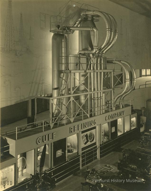 Gulf Refining Company display at the Century of Progress 1933-34 Chicago World's Fair. Curving pipes and cylinders appear to come out of the roof of a one-story structure with window displays across a passageway from rows of machines. The pipes are in front of a wall showing drawings of derricks. Photo is mounted on ecru paperboard mat.Photograph Details