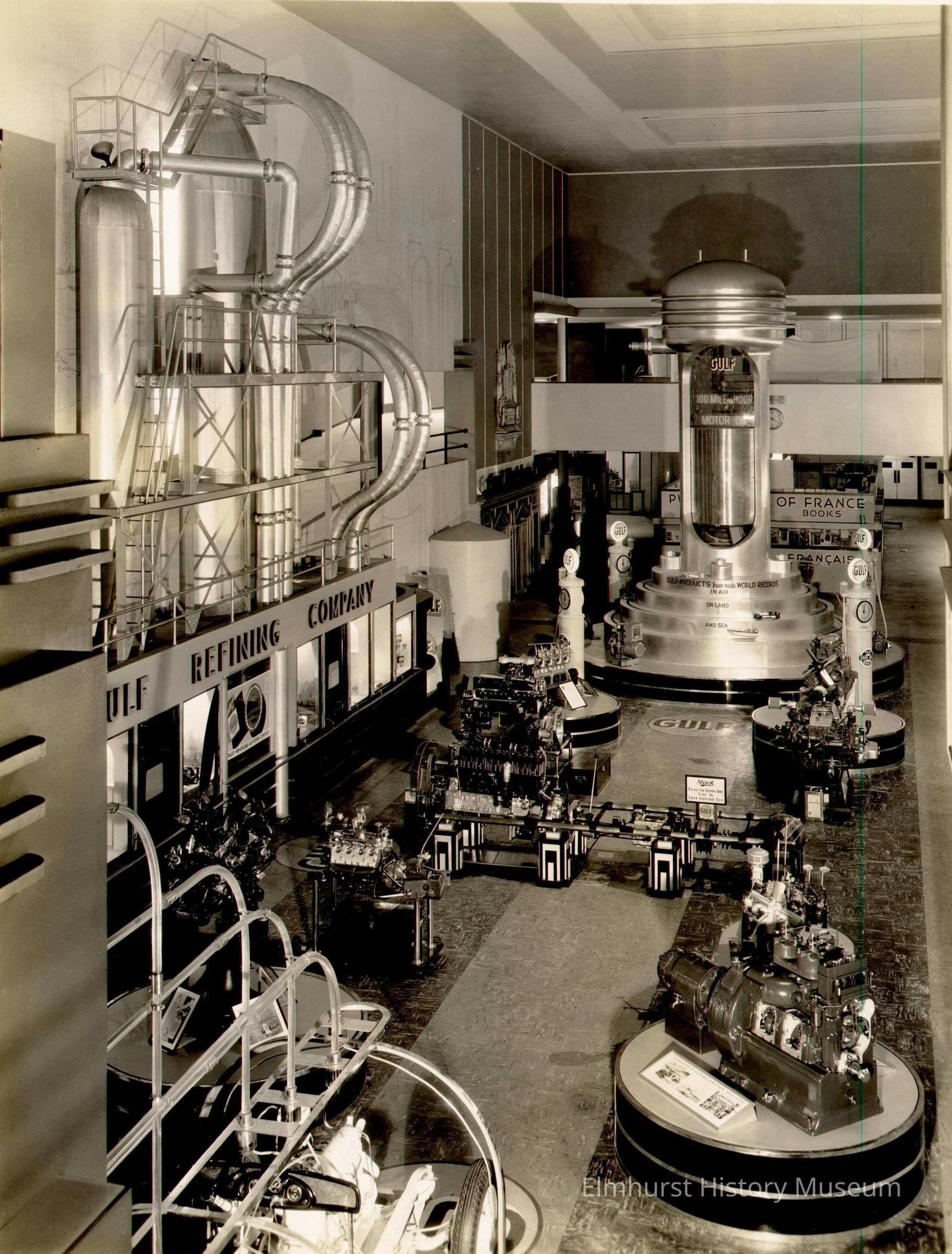 Gulf Refining Company display at the Century of Progress 1933-34 Chicago World's Fair. This is an interior shot with lots of mechanisms, pipes, dials and shiny cylinders. Four gasoline station pumps with "Gulf" in a circle on top are around a big container with a see-through panel for reading oil level. Various oil using motors are shown on low platforms. On an oil cylinder "GULF 100 MILE AN HOUR MOTOR OIL" and on another cylinder "GULF PRODUCTS HAVE MADE WORLD RECORDS IN AIR ON LAND AND SEA." This is a glossy print mounted on ecru paperboard mat.Photograph Details