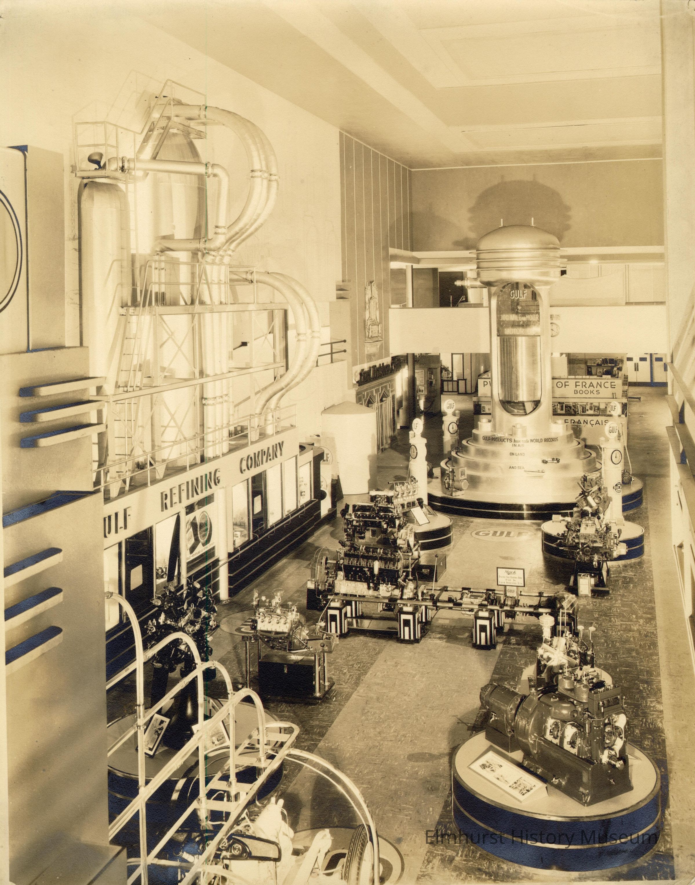Gulf Refining Company display at the Century of Progress 1933-34 Chicago World's Fair. This is an interior shot with pipes on the left, Gulf Oil products display with 4 gasoline pumps and gasoline-using motors on display tables. The Gulf name and slogans appear on the gas pumps and floor.Photograph Details