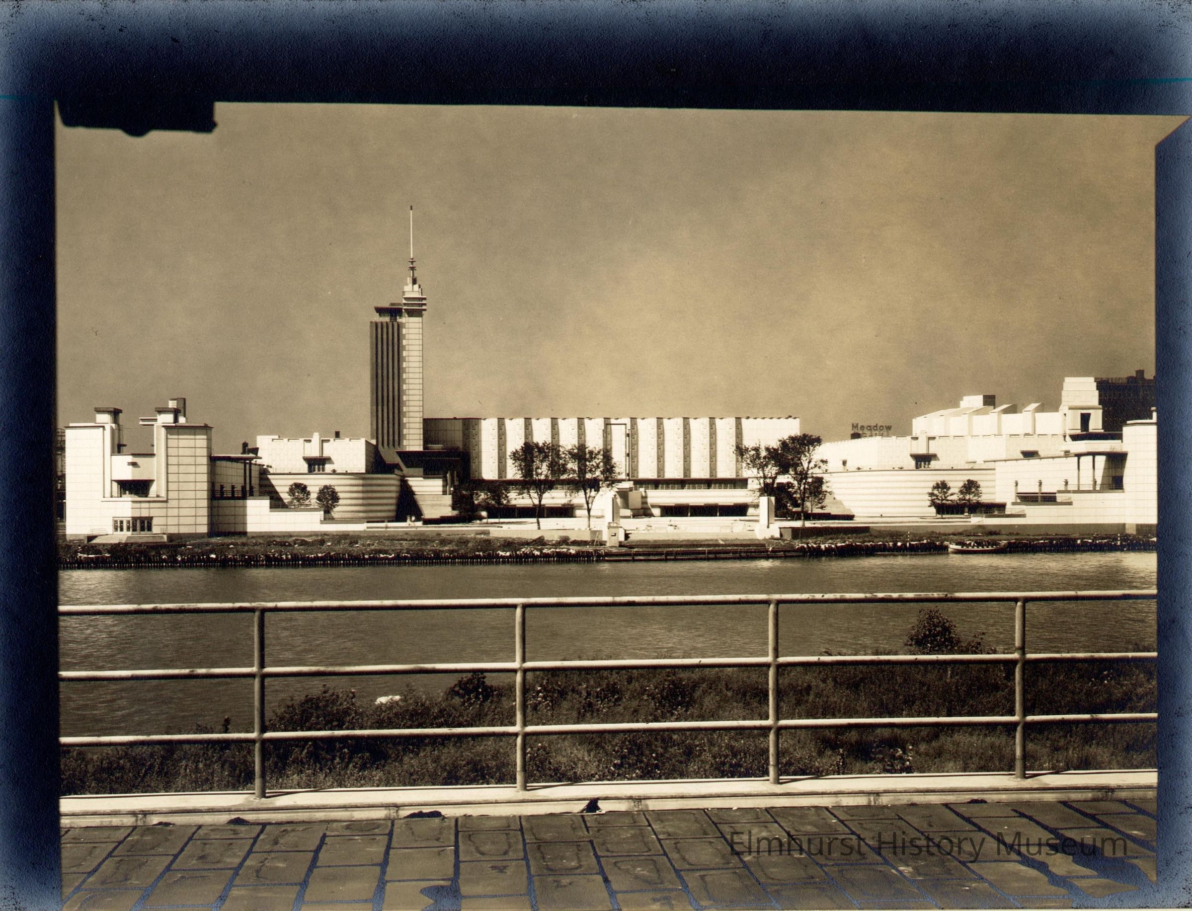Hall of Science at the Century of Progress 1933-34 Chicago World's Fair. View is from the Electrical Building, the doorway that frames image. Brick sidewalk and railing are in the foreground. Across the lagoon the tower of the Hall of Science is at left center with the wall of the great hall to its right and another low building to the left. A Meadow Gold sign shows over the roof of another building at right. Photo has matte finish and is mounted on ecru paperboard mat.Photograph Details