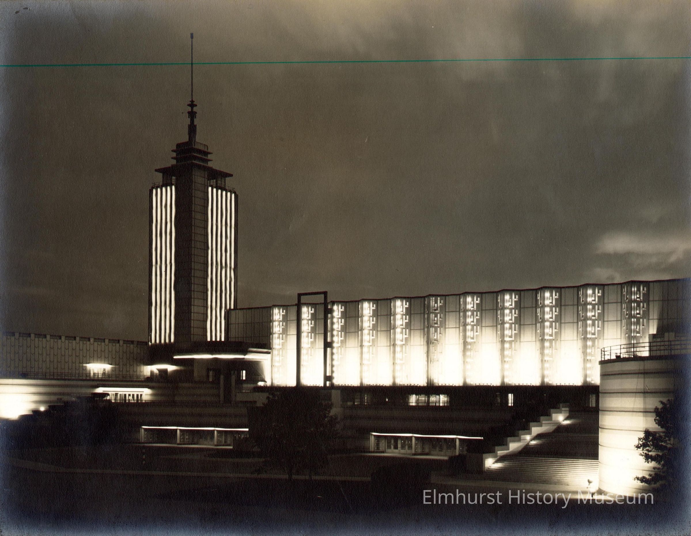 Night view of the Hall of Science at the Century of Progress 1933-34 Chicago World's Fair. Foreground and sky are dark. Tower at center left is illuminated by vertical strips of light. Side of the great hall with its geometric designs is brightly lit. Floodlights show steps at right and rounded side of a building. A few other spots of light punctuate the darkness. Photo is mounted on ecru paperboard mat.Photograph Details
