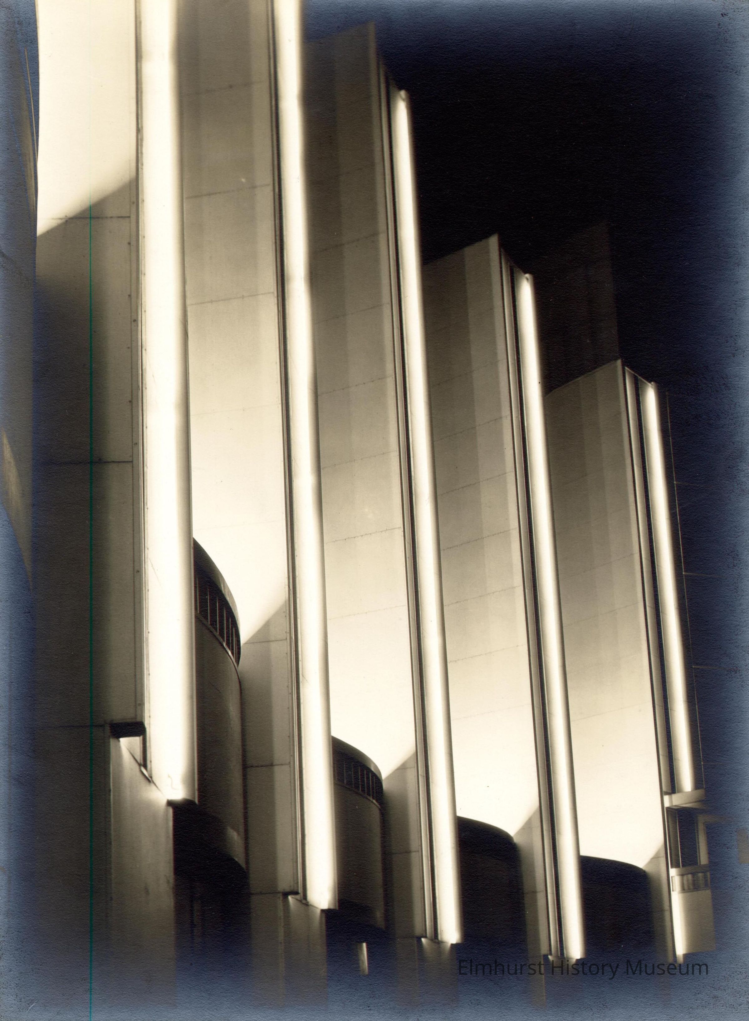 Pylons at the north entrance of the Hall of Science at the Century of Progress 1933-34 Chicago World's Fair. Photo is in sharp contrast with 5 lighted vertical shafts with dark rounded shapes. Between them light emanates to show the sides of the pylons. Camera angle is from below left. Sky is dark. Photo is mounted on ecru paperboard mat.Photograph Details