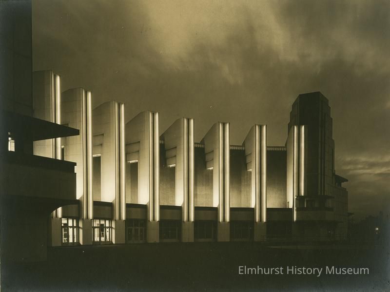 Night view of the north entrance of the Hall of Science at the Century of Progress 1933-34 Chicago World's Fair. Eight lighted white pylons contrast with the dark entrance tower and the projecting corner and balcony of another building at left. Pylons are attached to a rounded wall. Two windows of bottom story are illuminated at left. Photo is mounted on ecru paperboard mat.Made/Created