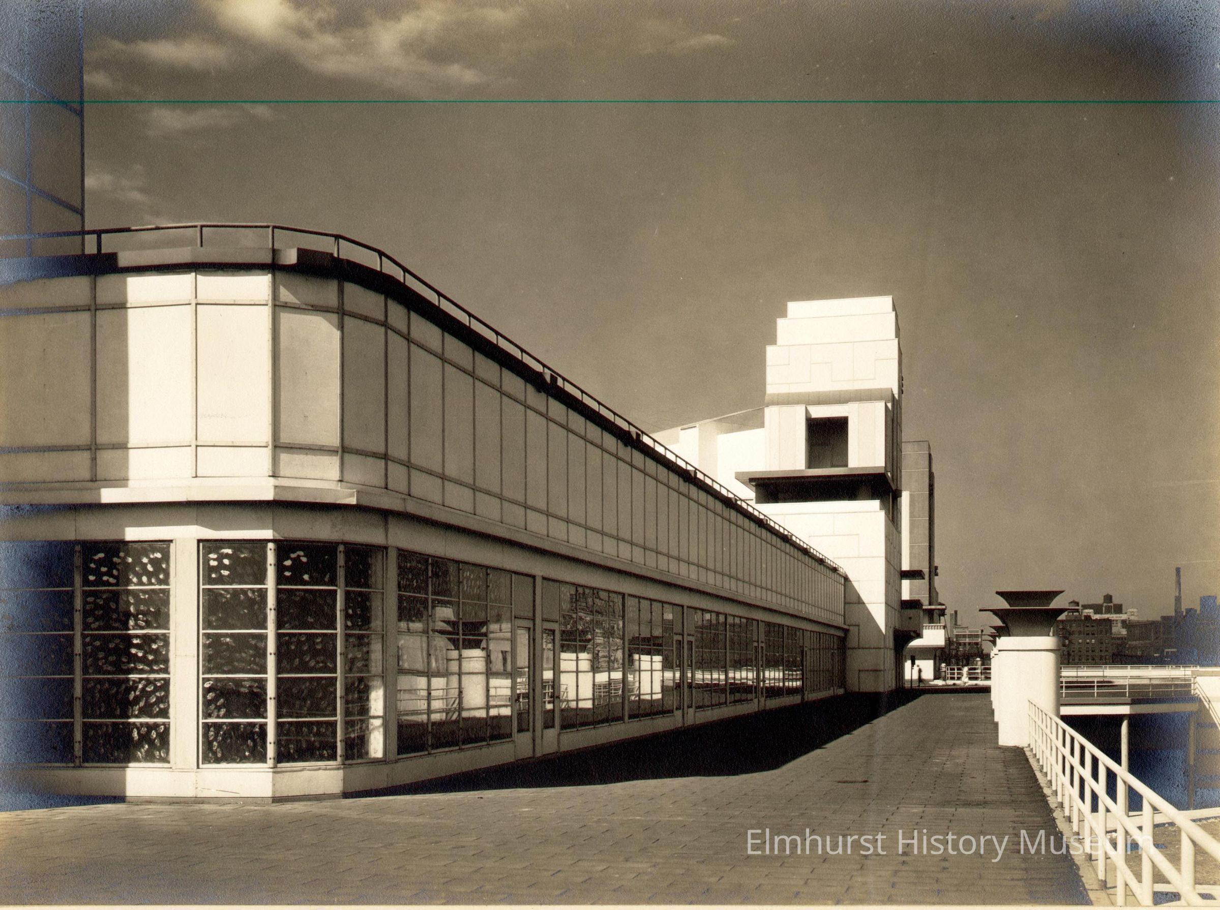 Hall of Science at the Century of Progress 1933-34 Chicago World's Fair. Tower is at the end of a long 2-story building with windows comprising the lower story with a wall above with rectangular blocks surmounted by a dark colored top with railing. Brick paved roadway runs along the building. White railing and small pillars separate the roadway from an opening at right which appears to be a tunnel. Photo is mounted on ecru paperboard mat.Photograph Details