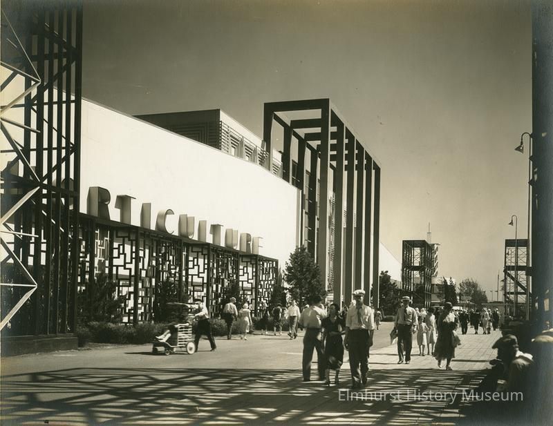 View of the Horticulture Building at the Century of Progress 1933-34 Chicago World's Fair. Building is at left in photo. A road and walkway center and right have many pedestrians and a chair on wheels with an occupant is pushed by a man in an uniform. Building surface is brilliant white with an openwork metal framework reaching halfway up. Three sets of six vertical bars extend above the building in front. Central building facade is taller and decorated with square designs. Shadow of an open grilled overhead canopy is across the roadway. Cut out letters on the side of the building read "HORTICULTURE." Photo is mounted on ecru paperboard mat.Photograph Details