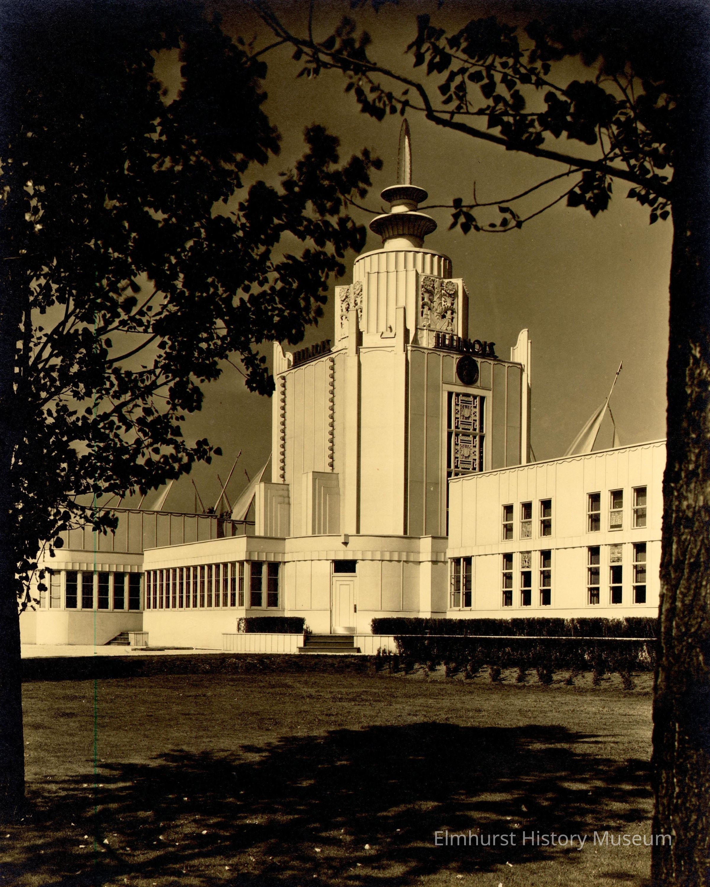 This is the Illinois Host Building at the Century of Progress 1933-34 Chicago World's Fair. Branches of two large trees frame the tower and clipped hedges line the sidewalks. This appears to be the "back" entrance. Many flagpoles with flags are visible over the wings. Photo is mounted on ecru paperboard mat.Photograph Details