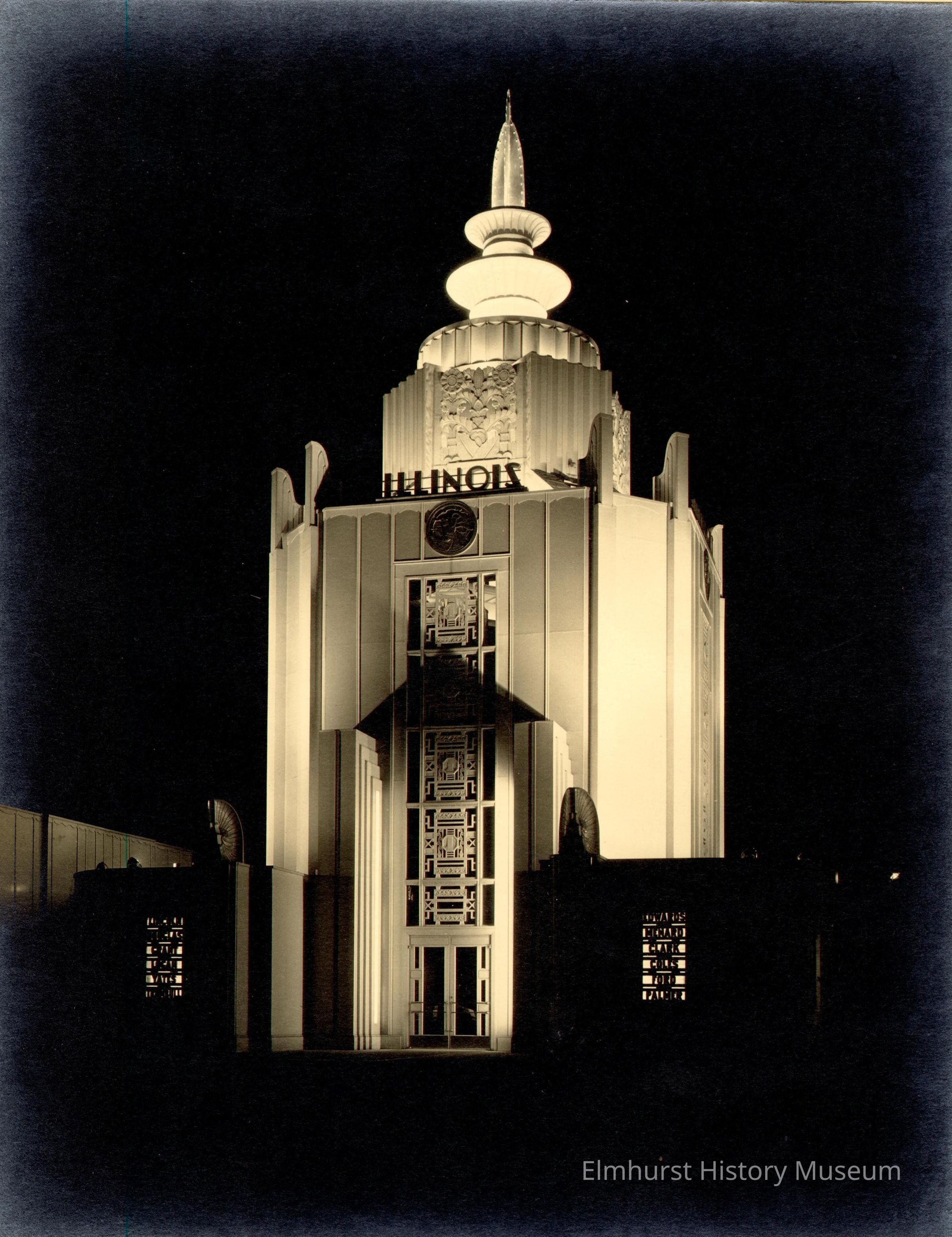 Illinois host Building at the Century of Progress 1933-34 Chicago World's Fair, at night. Squared base and round top of the building are brightly illuminated against black surroundings. The word ILLINOIS in black letters shows in front of the rounded part of tower. Near the base cut-out sections of wall show the names of counties. A decorative panel goes from the top of the entrance doors to the state seal at the top. Photo shows very dramatic lighting effect. Photo is mounted on ecru paperboard mat.Photograph Details