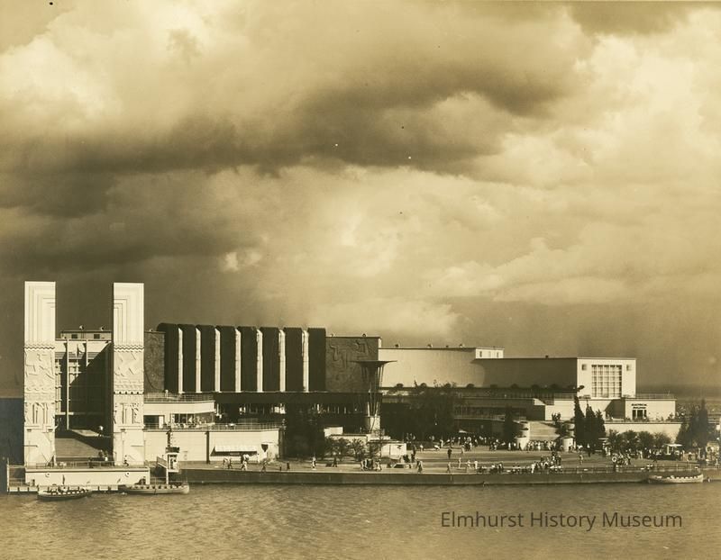 Lakefront view of the Century of Progress 1933-34 Chicago World's Fair. A large long building with 2 square towers at the entrance is at left. Bas-relief figures are on the tower and on wall in center. A dark section with 7 vertical columns of light is to left of tower. A boat landing is in front of the towers and 3 small boats are in the water. A fountain, surrounded by a large cement plaza, is in front of the building. Sky is very cloudy. Photo is mounted on ecru paperboard mat.Photograph Details