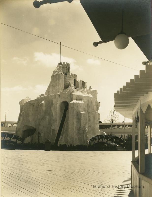 Magic Mountain and Enchanted Isle at the Century of Progress 1933-34 Chicago World's Fair. Photo shows a concrete monolith with a castle-like turret in the center. Bridges leading to it have railings with a swan design that is repeated. A low building is in back with an open space in which there are pig, donkey and other animal cutouts. A wide boardwalk is in front and an irregular roof line projects over the boardwalk at right. Photo is mounted on ecru paperboard mat.Photograph Details