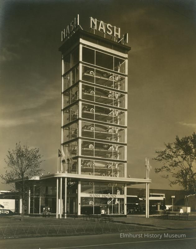 Nash Motors Building at the Century of Progress 1933-34 Chicago World's Fair. A glass rectangular tower topped with "NASH" on all sides encloses 7 cars stacked in layers in metal frames. Near the bottom of the tower is "NASH MOTORS." On a truck at left is "PGSX 1000." Some benches and a suggestion of fencing are in front of the base of the tower. Some flags are flying on poles atop a framework at the base of the tower. A mid-size tree is on each side of the tower. A roadway is at the bottom edge. Photo is mounted on ecru paperboard mat.Photograph Details