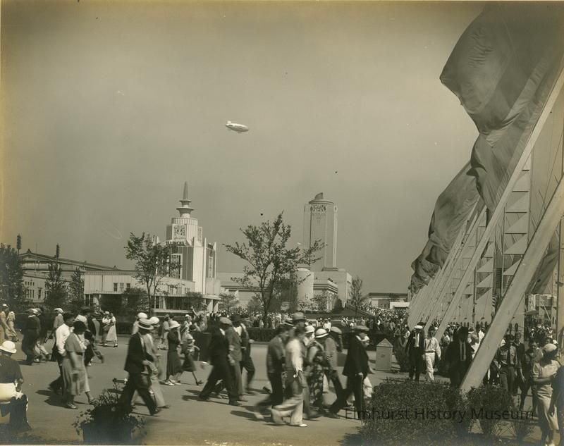 A sidewalk scene from the Century of Progress 1933-34 Chicago World's Fair, with Illinois Host and Sears Roebuck Buildings in the background. Pedestrians fill a plaza between the white Illinois Host Building and a structure with large molded or carved figures supported by diagonal beams under which people are walking. Tower of the Sears building is in the center and a dirigible is in the sky beyond the buildings. Small trees are spaced about the plaza. Photo is mounted on ecru paperboard mat.Photograph Details