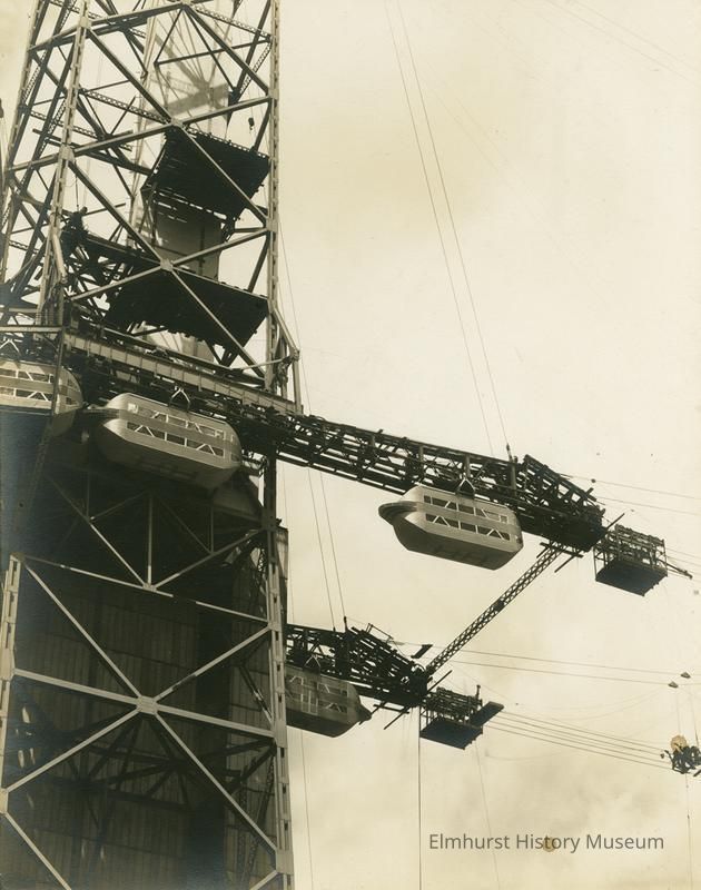 Framework of steel tower rising on left side. This is the Sky Ridge at the Century of Progress 1933-34 Chicago World's Fair. Four streamlined enclosed cars are shown entering or leaving tower area. Platforms for entering and leaving cards are also evident as well as supporting wires. Photo is mounted on ecru paperboard mat.Photograph Details