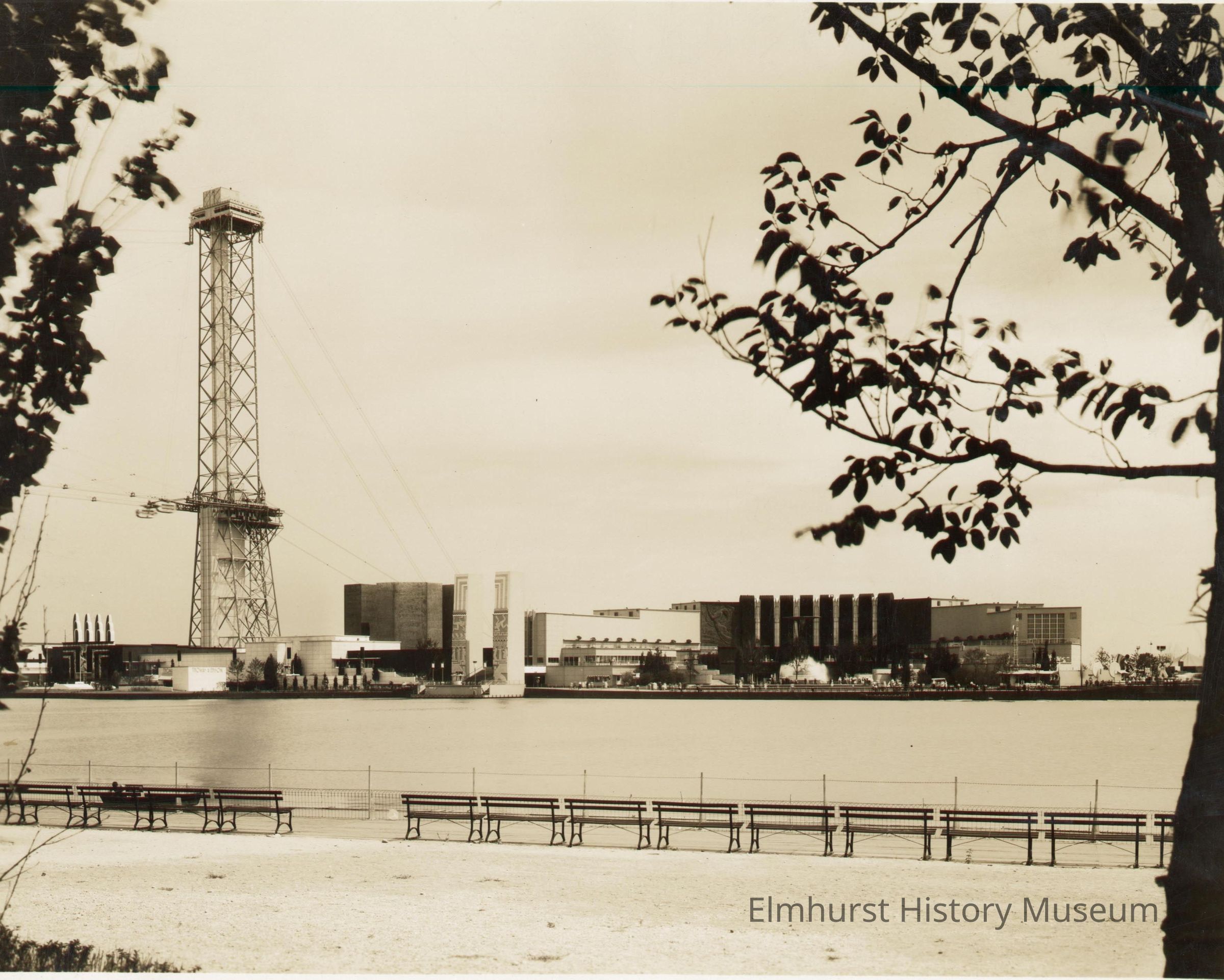 Photo with lake front view with Century of Progress 1933-34 Chicago World's Fair Sky Ride Tower in the left distance. The Electrical Building is in the center distance. Benches are lined along the shoreline. Photo is mounted on ecru paperboard mat.Photograph Details