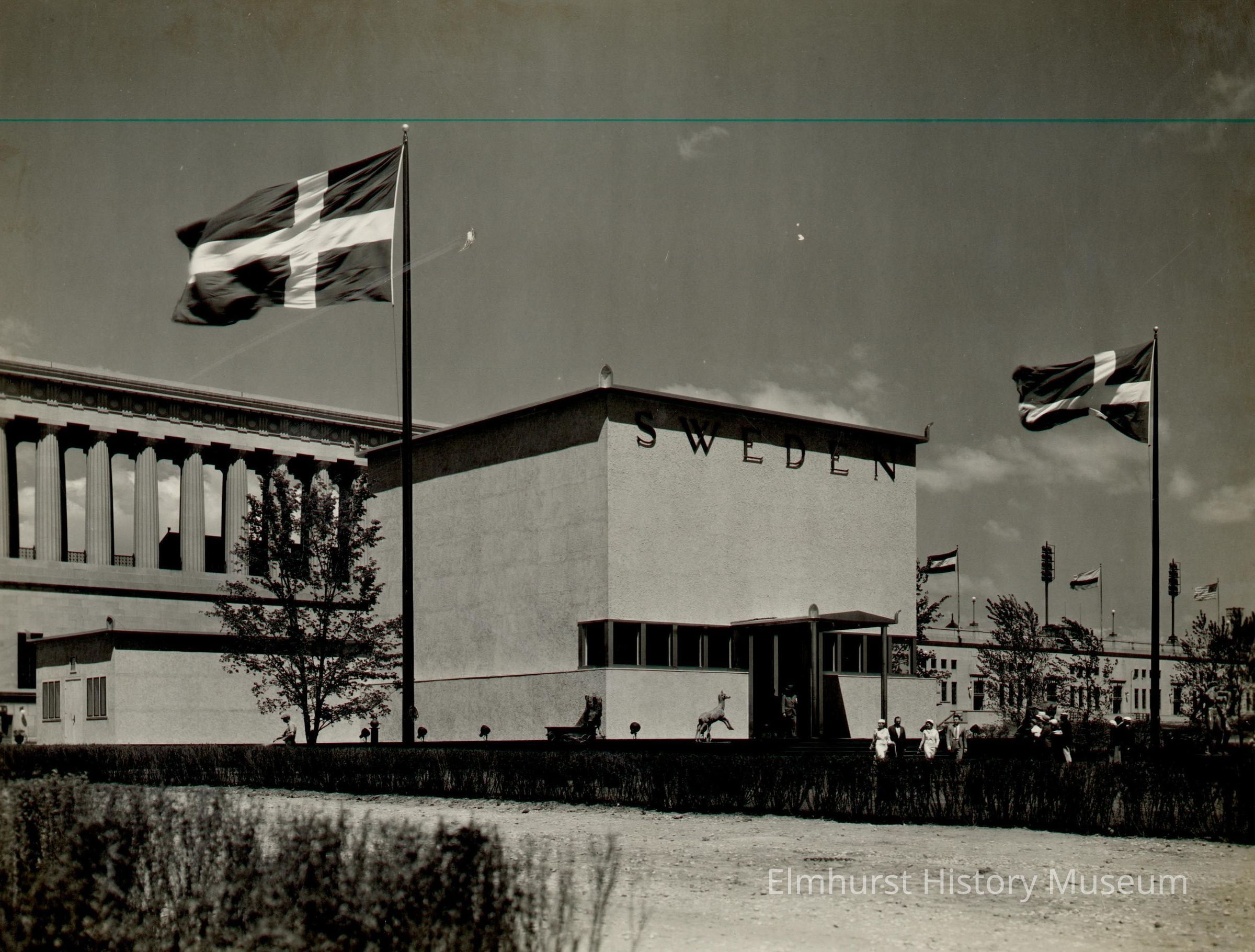 Square building center reads "Sweden" near the roofline. This is the Sweden building at the Century of Progress 1933-34 Chicago World's Fair. Two pillars support a roof over the doorway and a statue of a horse is at top of steps. Swedish flag is atop a pole on each side of the building and the pillars of Soldier Field are in the background. Photo is mounted on ecru paperboard mat.Photograph Details