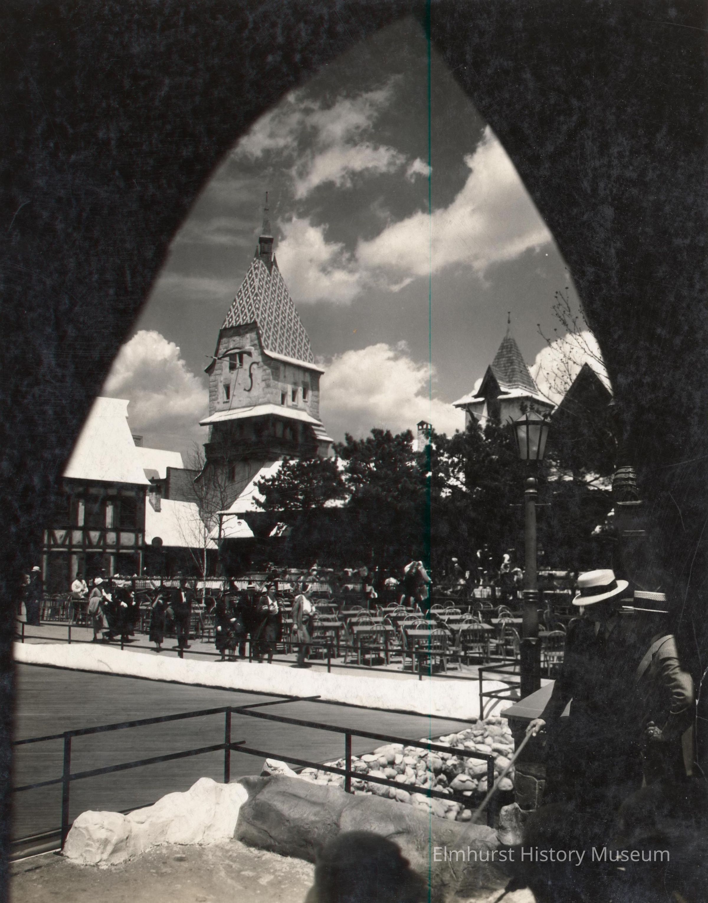 Village scene at the Century of Progress 1933-34 Chicago World's Fair. Scene is shot through an arch. Man with a straw hat and a cane is at right foreground. Rocks and a fence surround a pool at left foreground. Tables and chairs are set up beyond the pool and people are walking or standing near the tables. Two buildings with towers are visible against a sky with fluffy clouds. One tower has a diamond-patterned roof. A lamp post is at right foreground.Photograph Details