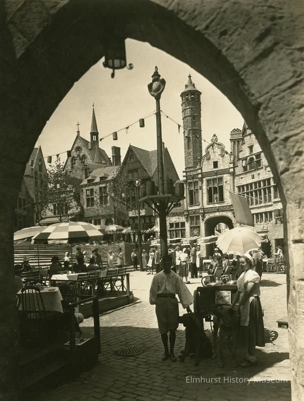 Sidewalk scene in the Old Heidelberg complex in the Village of the Century of Progress 1933-34 World's Fair in Chicago. Photo is looking through an archway at people gathered in a courtyard with building fronts in the background. Photo is matted on ecru paperboard.Photograph Details