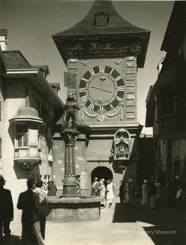 Handwritten script on back: 25. Langdon Longwell Collection. / village sidewalk scene with clock tower Stamped script on back with number penciled in: Hedrick Blessing Studio / 540 No. Michigan Ave. / Chicago, Ill / Neg. No. 2307-A