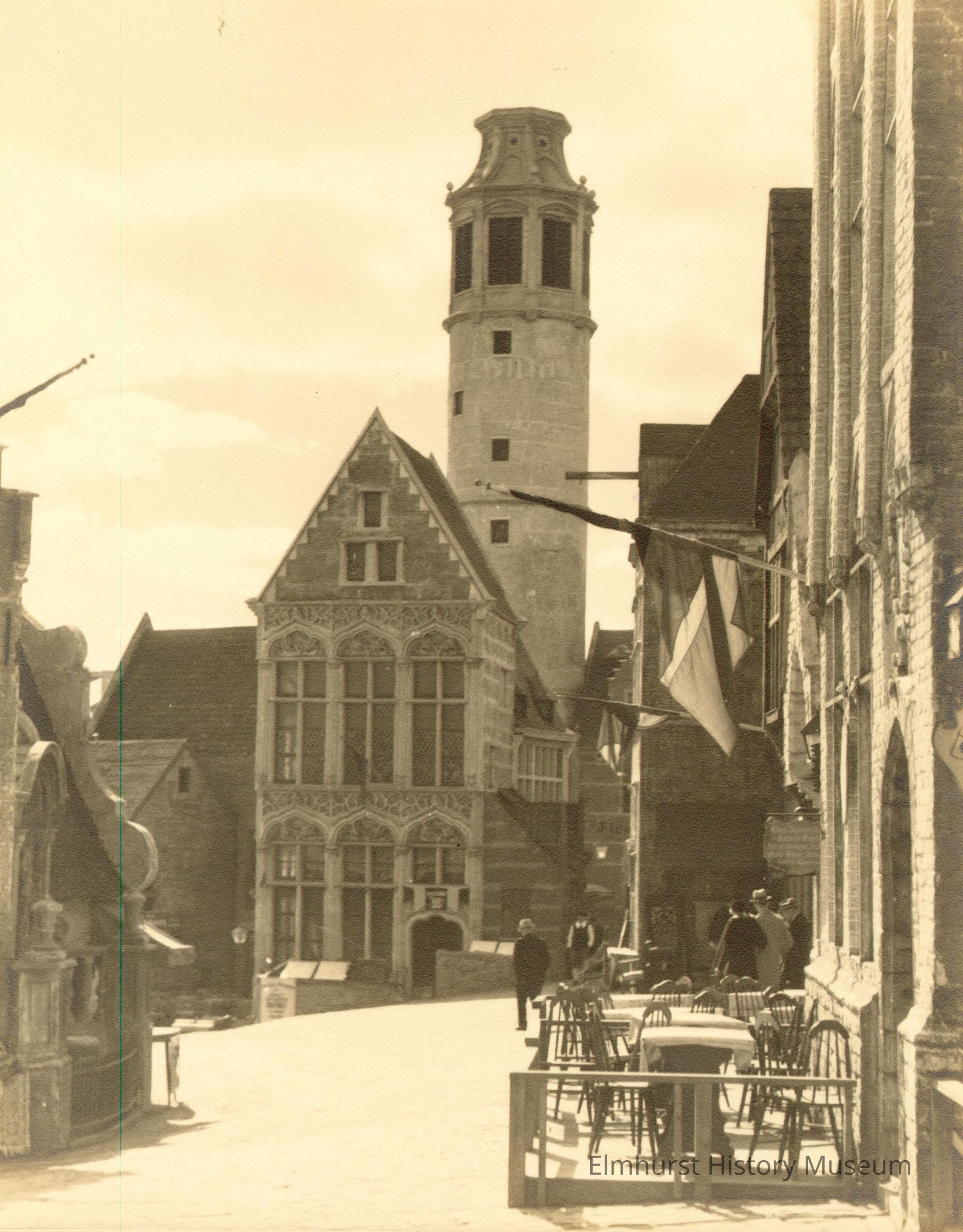 Scene from the Century of Progress 1933-34 Chicago World's Fair, showing in center a building with arched windows and a round tower with small square openings and 4 visible large windows near the top. View is across a raised platform in front of buildings on the right with a rail enclosure with tables covered with white cloths and chairs. On left is part of a building with peaked roof with scalloped edge. Flags on projecting poles are on buildings at right. Photo is mounted on ecru paperboard mat.Photograph Details