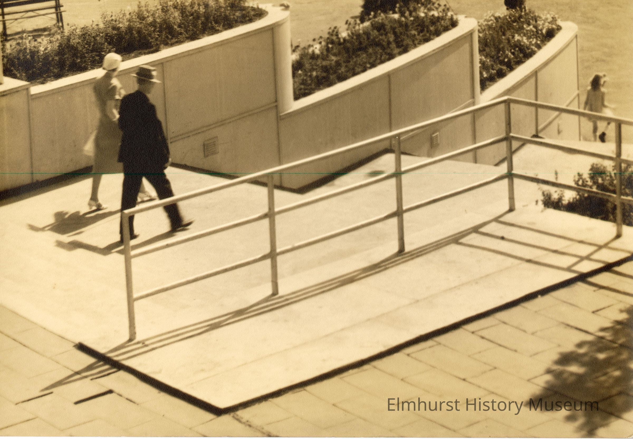 Stairs to the waterfront at the Century of Progress 1933-34 Chicago World's Fair. Brick paving and cement steps and wall dominate the photo. A man in a dark suit and hat and a woman in summer dress, white shoes and hat are walking toward the steps down to the water. A child is on the bottom step. Three flower beds enclosed with cement are at different levels of the stairs.Photograph Details