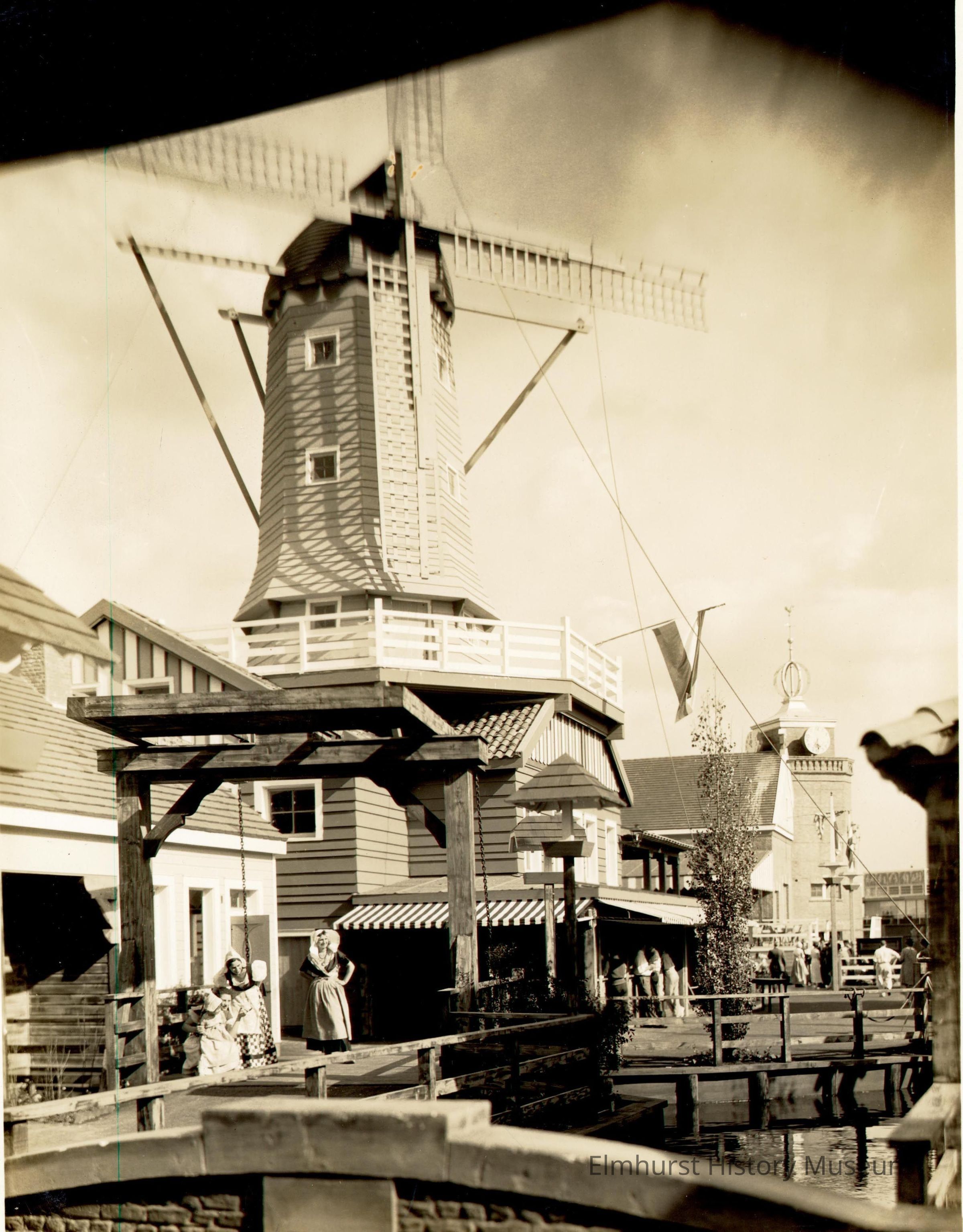 Windmill at Century of Progress 1933-34 Chicago World's Fair. Wooden windmill with 3 sails is in the center. Two women and a girl are in costume on a platform beside water in front. A white wooden railing is around a walkway around windmill just above roofline of base structure. A tr-color flag is at an angle from the railing. Building with a clock and a decorative open-work finial is beyond the windmill. Photo has glossy surface and is mounted on an ecru paperboard mat.Photograph Details
