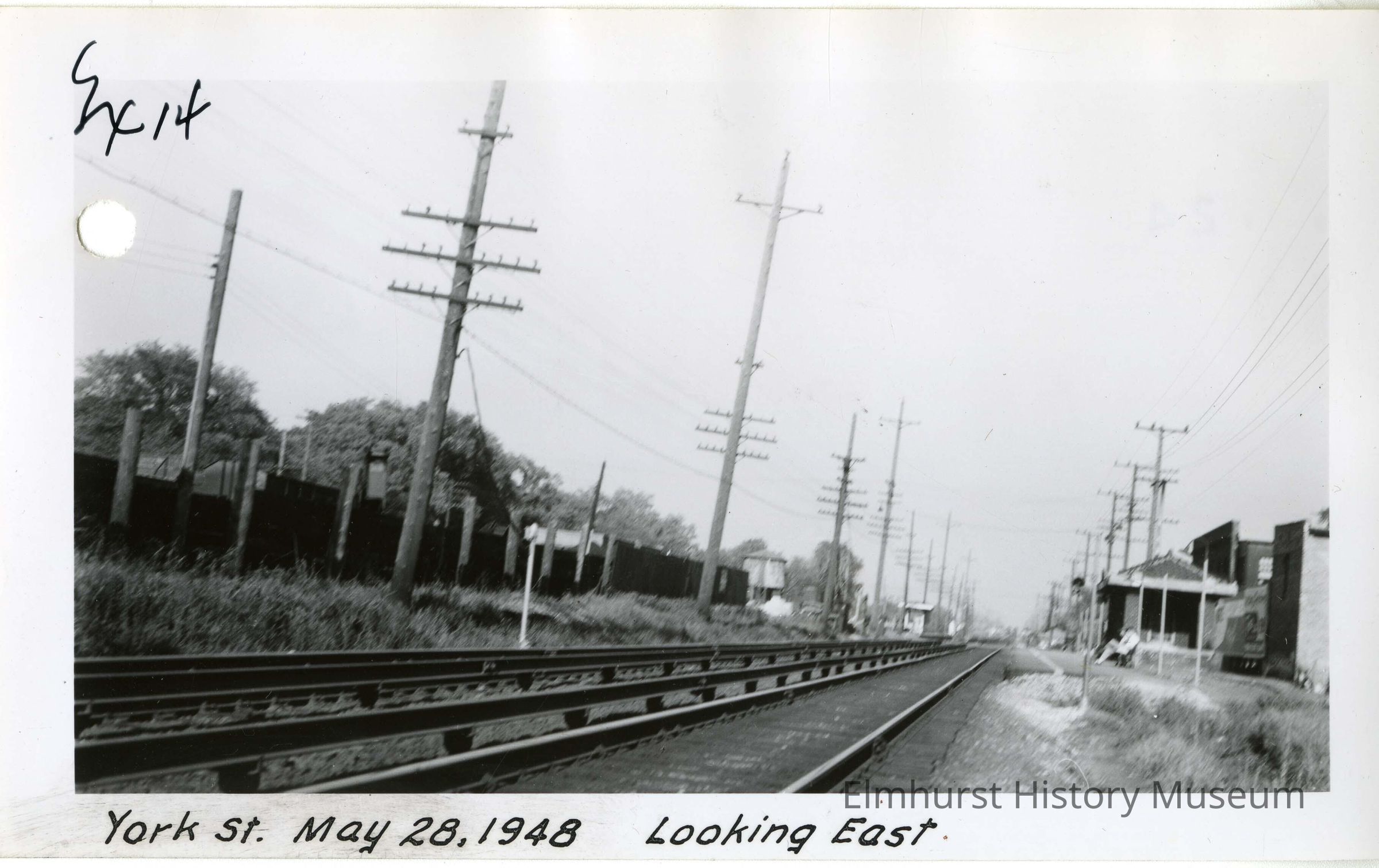 View of the York Street Chicago Aurora and Elgin railroad crossing, looking east towards York Street. Photo was taken for the legal case "Illinois Commerce Commission v. Chicago Great Western Railway Company, Chicago Aurora and Elgin Railway Company, and the City of Elmhurst."Photograph Details
