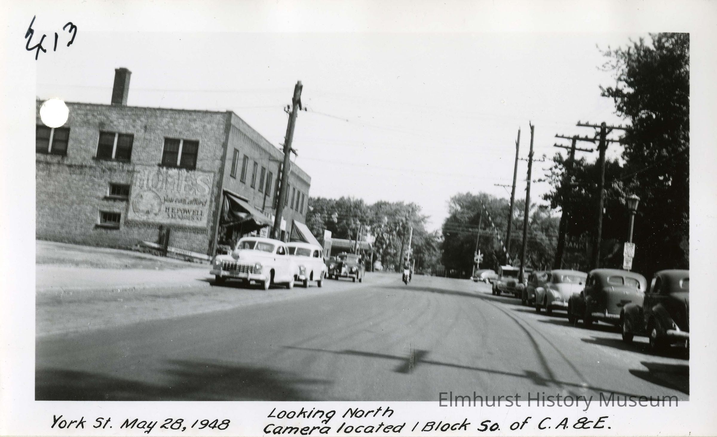 York Street Chicago Aurora and Elgin railroad crossing, looking north on York Street. Photo was taken for the legal case "Illinois Commerce Commission v. Chicago Great Western Railway Company, Chicago Aurora and Elgin Railway Company, and the City of Elmhurst."Photograph Details