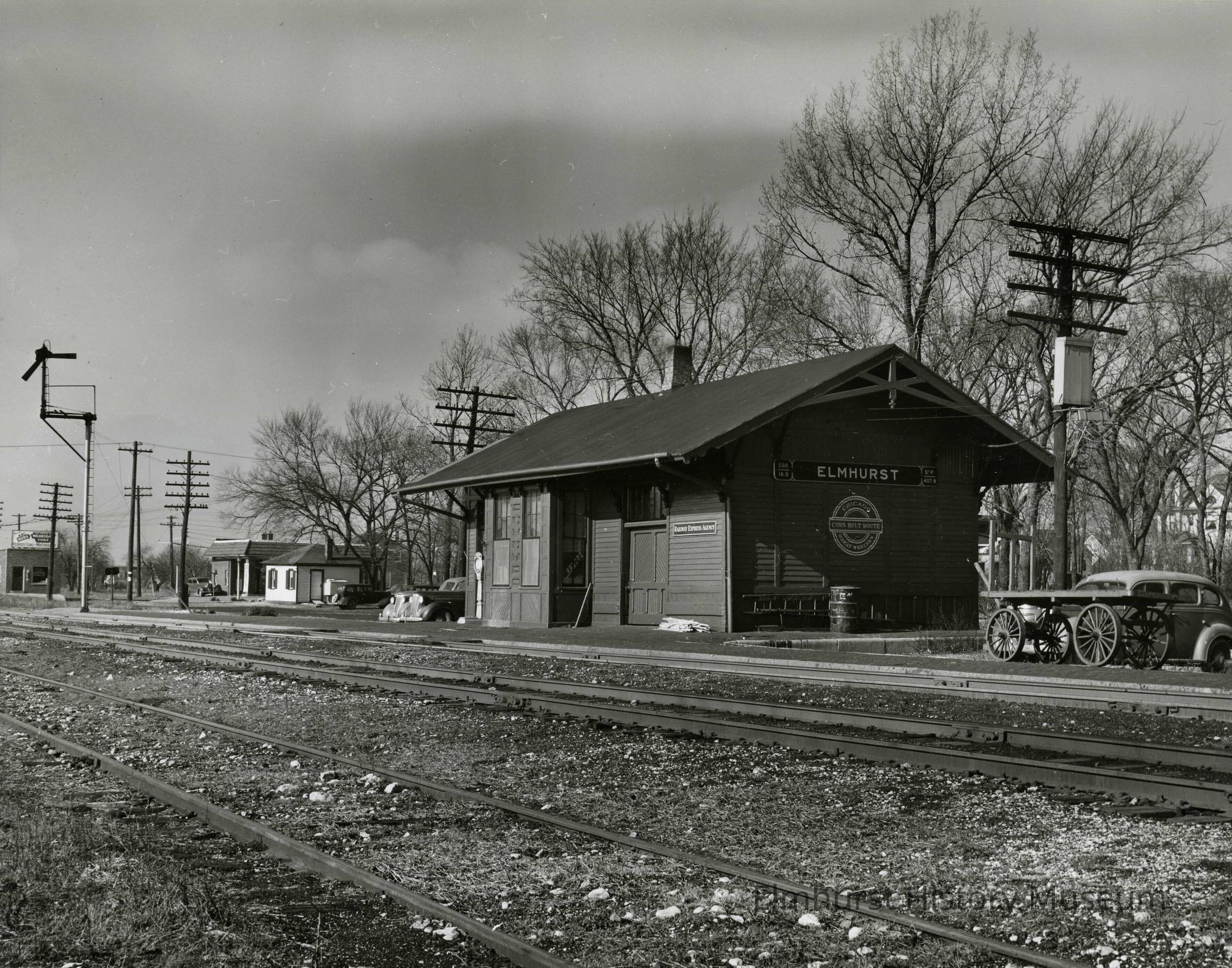 Handwritten on back in black ink: Elmhurst. Railroad Stations / Chicago. Great.Western station-east off York Street / Photo-Harold Selonke-1941 Handwritten in pencil on back: Chgo Great Western RR Station Stamped on back: Elmhurst Public Library / Elmhurst ILL. 60126 / Elmhurst Historical Commission
