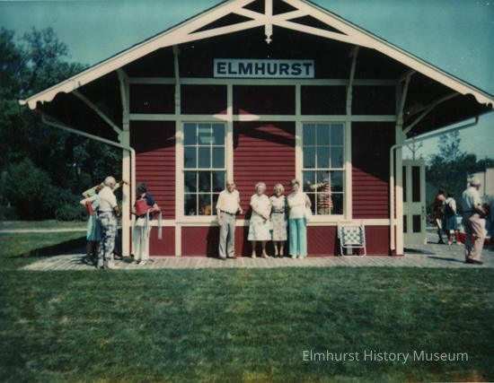 People posing in front of the Chicago Great Western Railway depot at the dedication of Bicentennial Fountain in Wild Meadows Trace park.Photograph Details