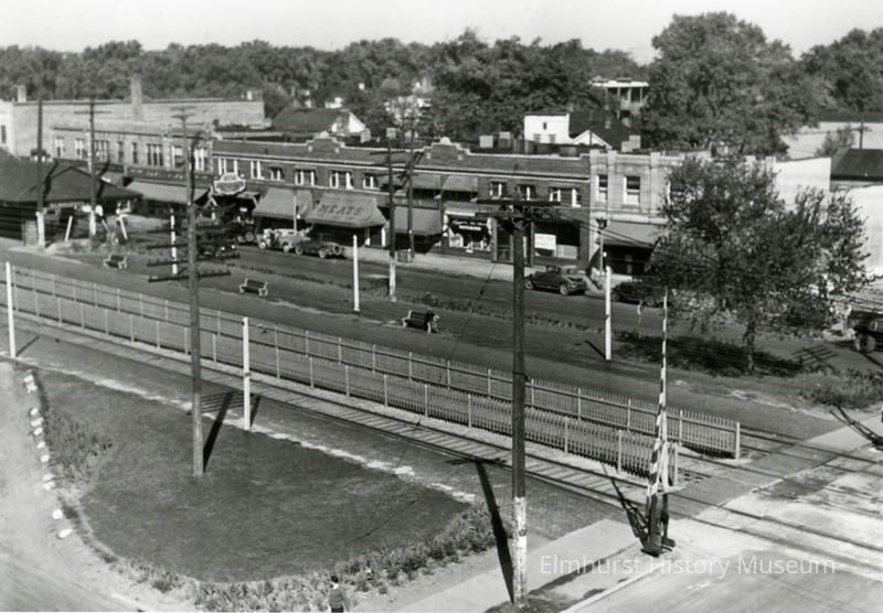 Chicago & North Western Railroad tracks and grounds looking northwest from York Street along the shopfronts on W. First Street.Photograph Details